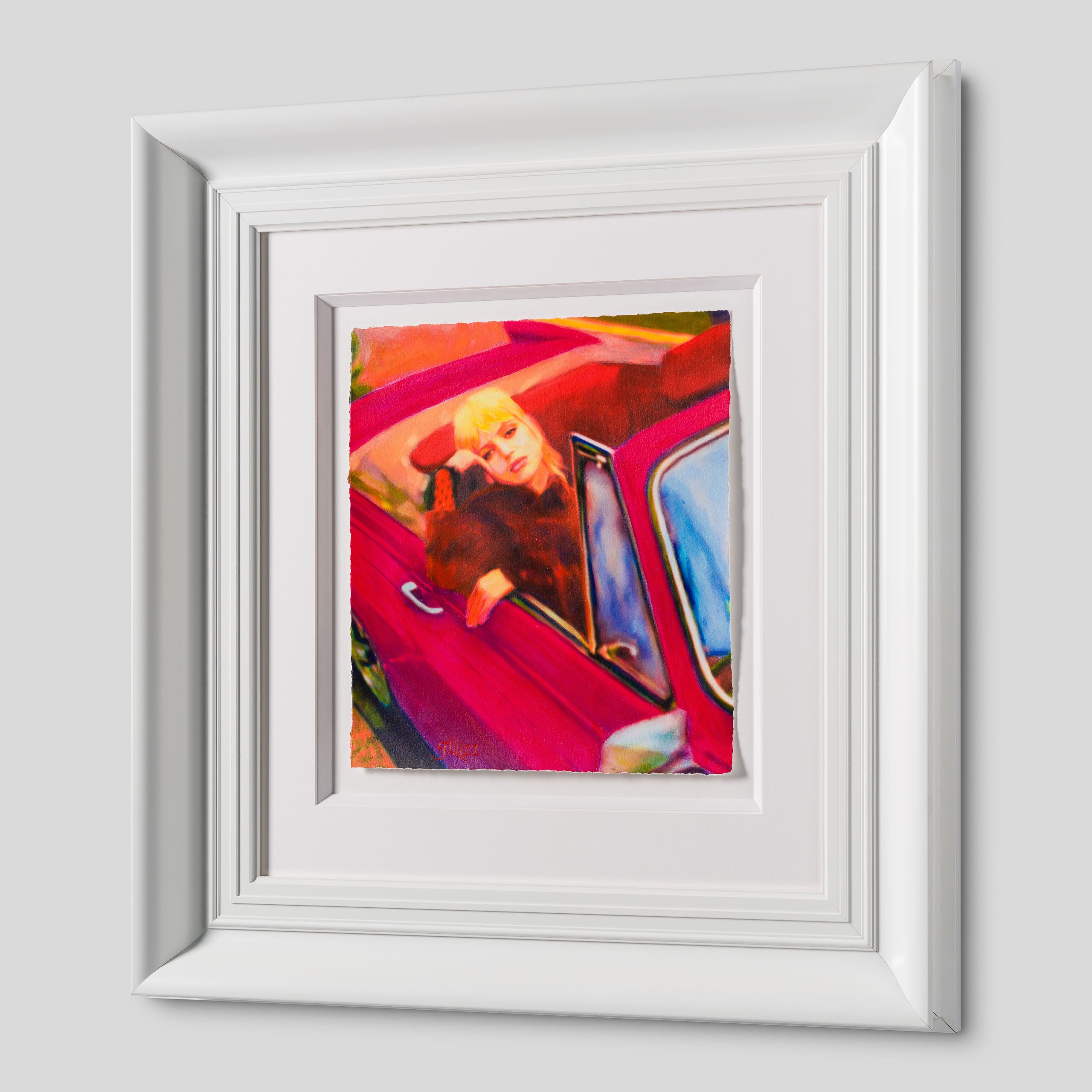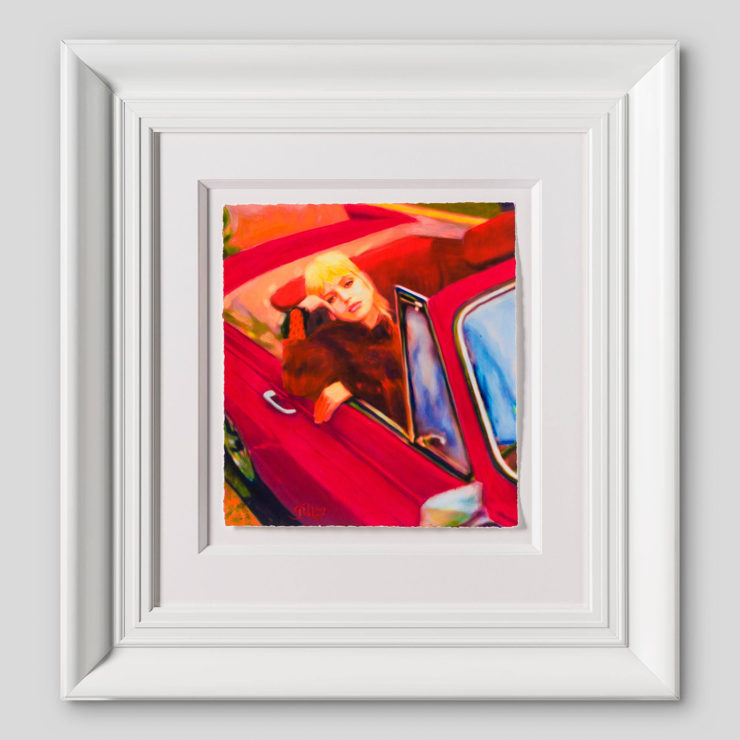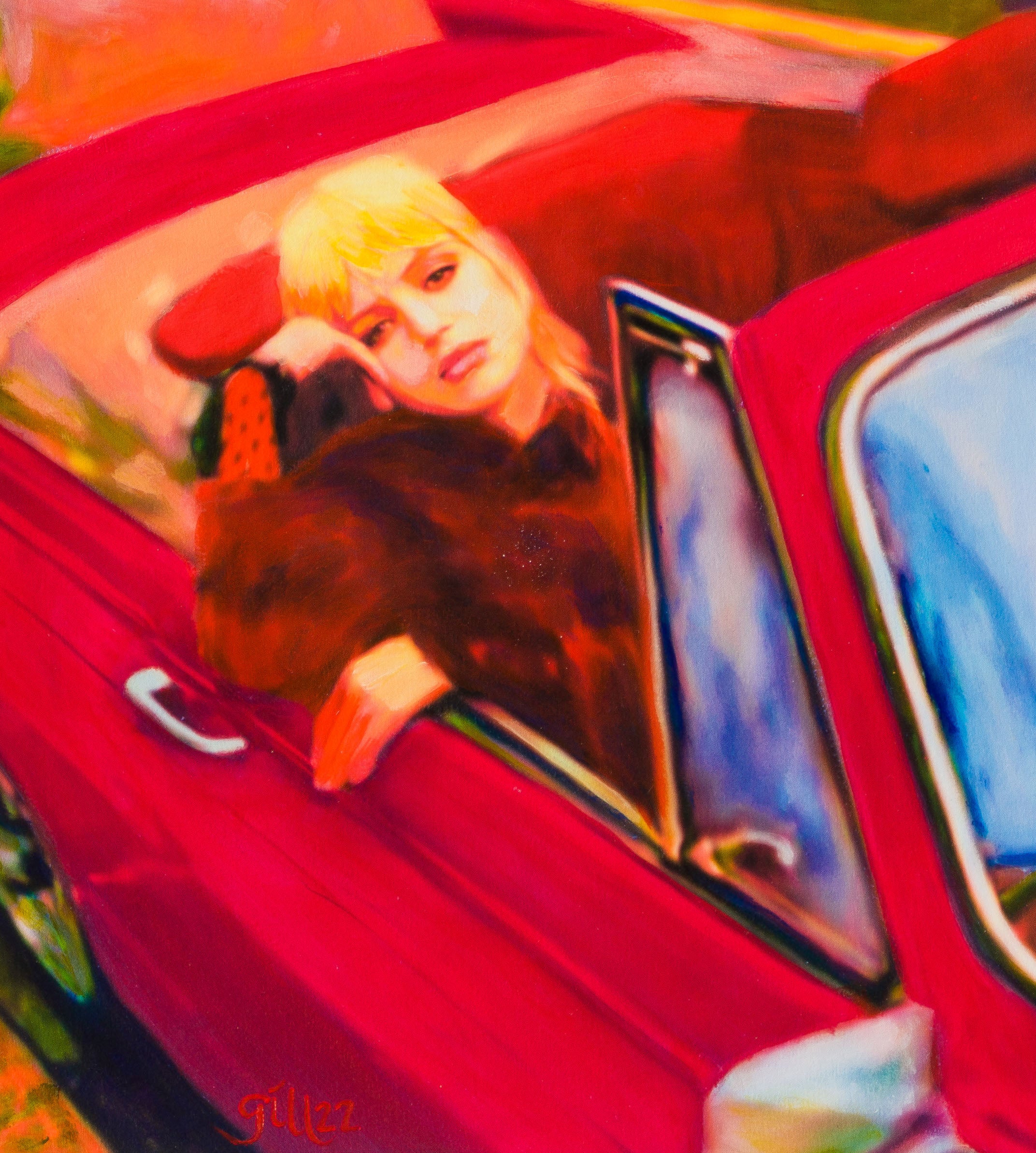 In this romantic piece, Gill uses warm red tones to evoke the serenity of “California Dreamin’. The model takes centre stage with a calm expression, while the burgundy car falls into second plan. The colours compliment each other beautifully with stand out details such as the model’s blonde hair, the almost out of focus background with touches of green and the blue toned glass. California Dreamin' is the perfect example of a strong bold angular study utilising primary colours. The details and minimalism of this piece bring an iconic and almost magic feel to it.