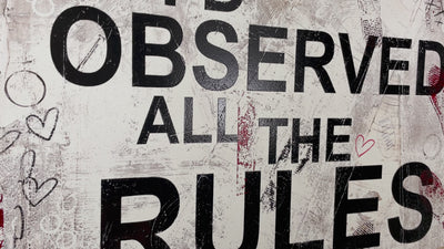 In this irreverent artwork, elusive artist James McQueen takes the rulebook of conformity and pointedly subverts it, stamping across its pages a playful provocation that urges us all to push boundaries in pursuit of our dreams.