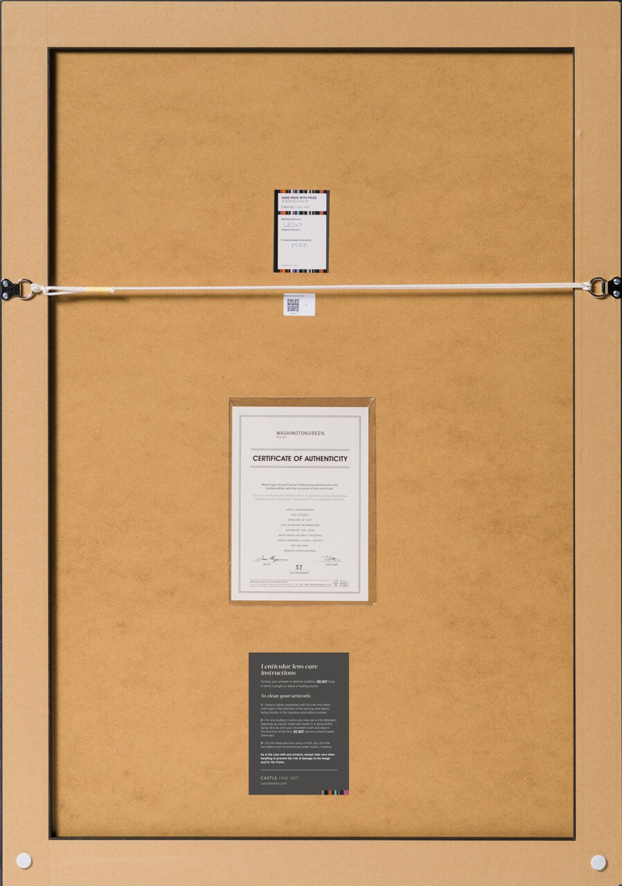 Due to the fragile nature of lenticular lens, this artwork includes a care sticker with all the information needed preserve the piece. More information can be found below.