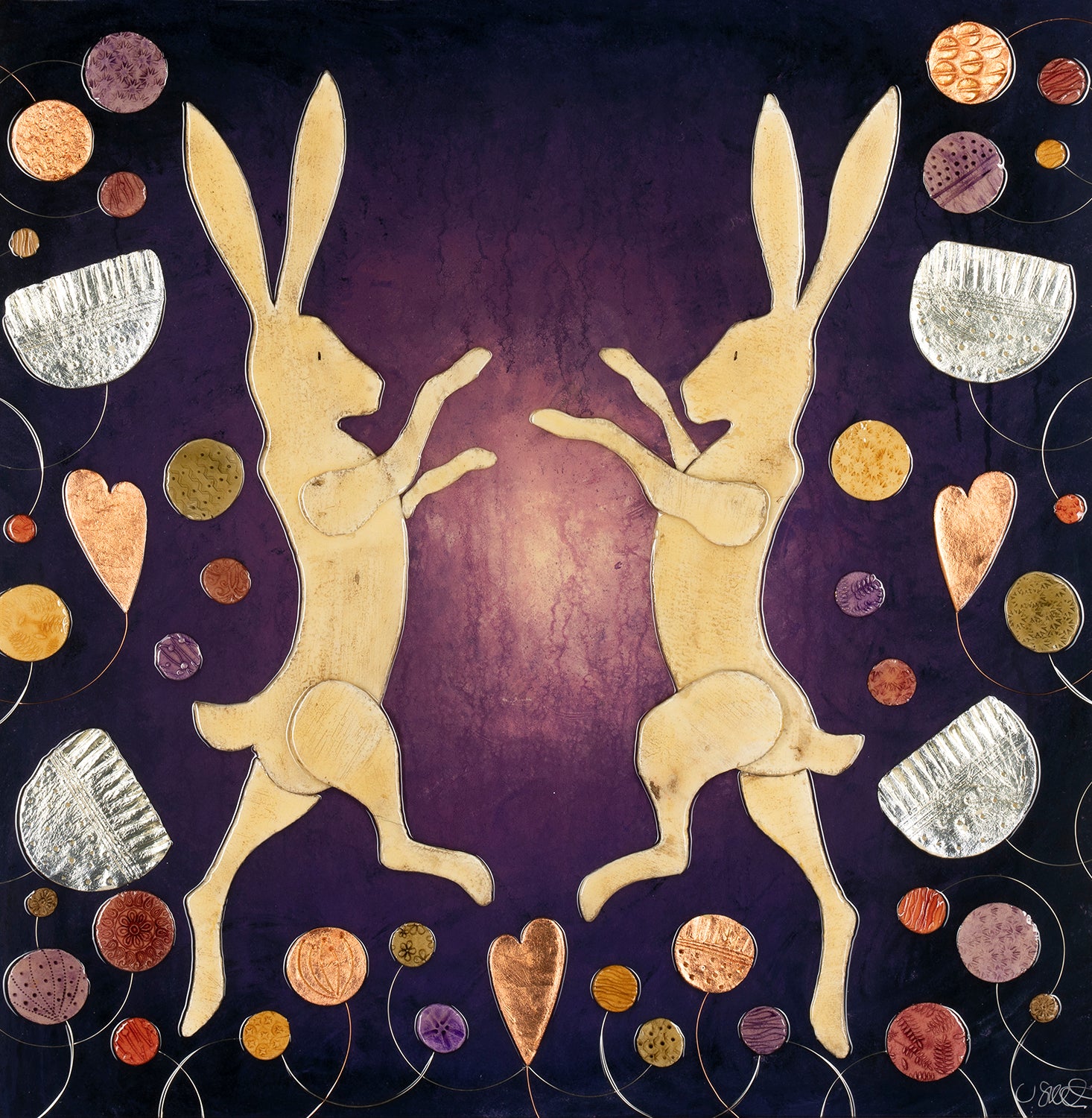 This original artwork by Jayne Smith incorporates a range of beautiful artistic materials including clay, fabric and gold leaf. The effect of adding these elements on top of a glossy resin surface is that of a sculptural relief which is a technique used as far back as Ancient Greece and popularised in 19th century America on momentous government buildings.