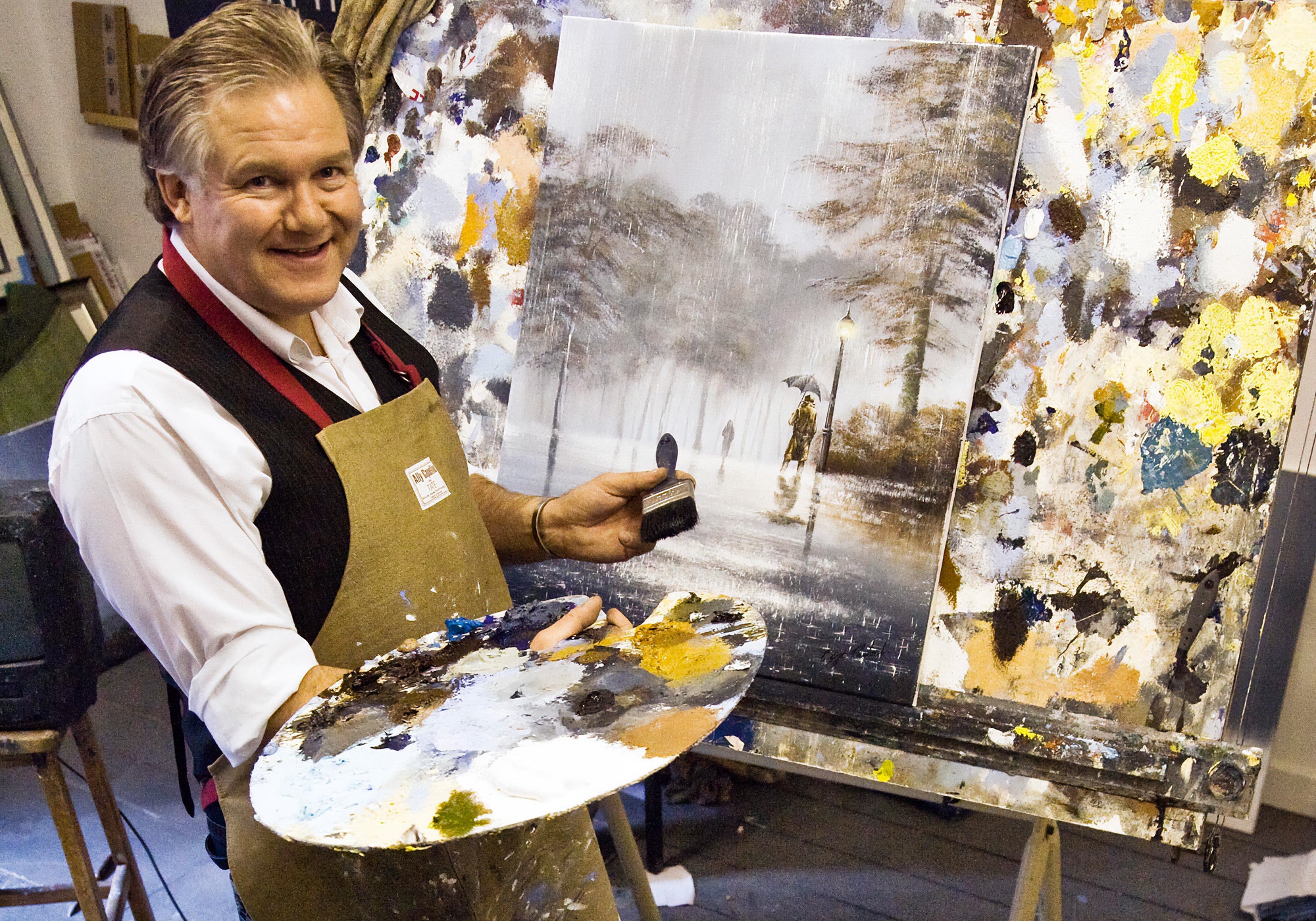 Known for his rain-soaked oil paintings during a career than spanned over 30 years, Jeff combined a romantic 1950s feel with his signature rain motif. The anonymous kissing couple in his artworks represents a feeling of togetherness.