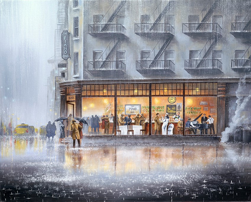 Known for his rain-soaked oil paintings during a career than spanned over 30 years, Jeff combined a romantic 1950s feel with his signature rain motif. The anonymous kissing couple in his artworks represents a feeling of togetherness.