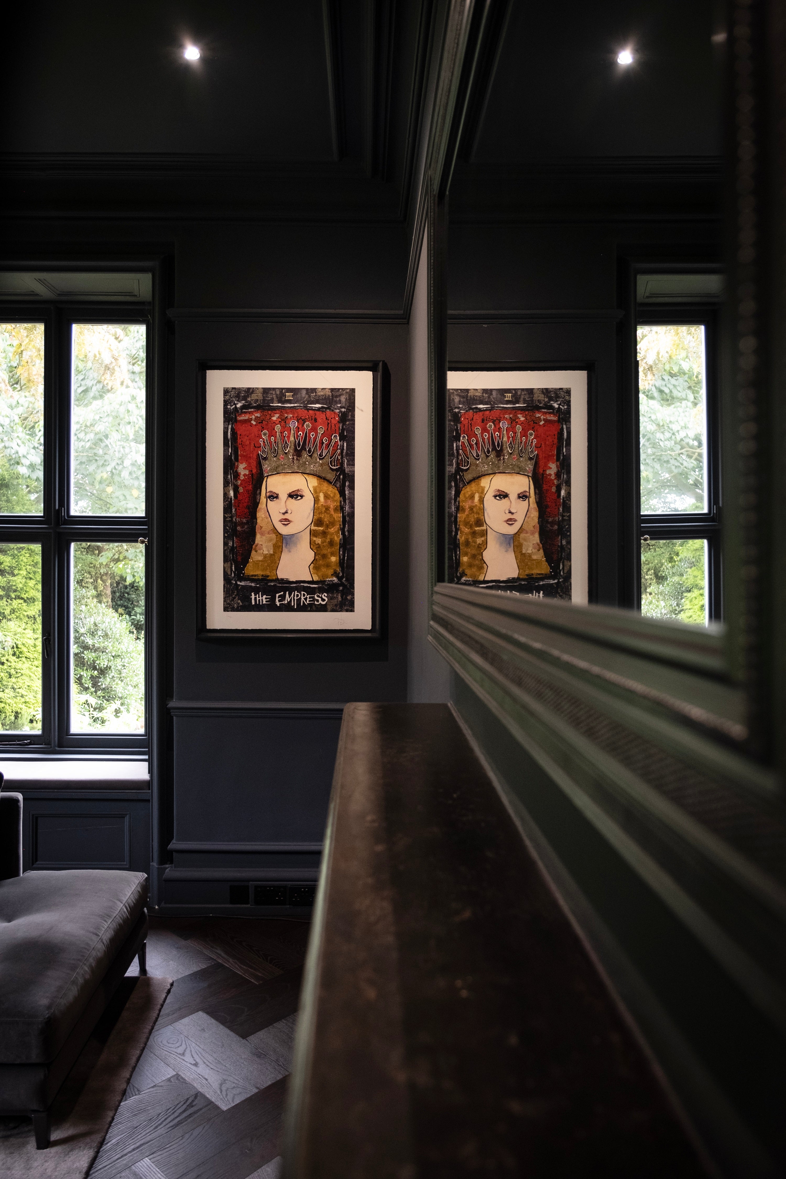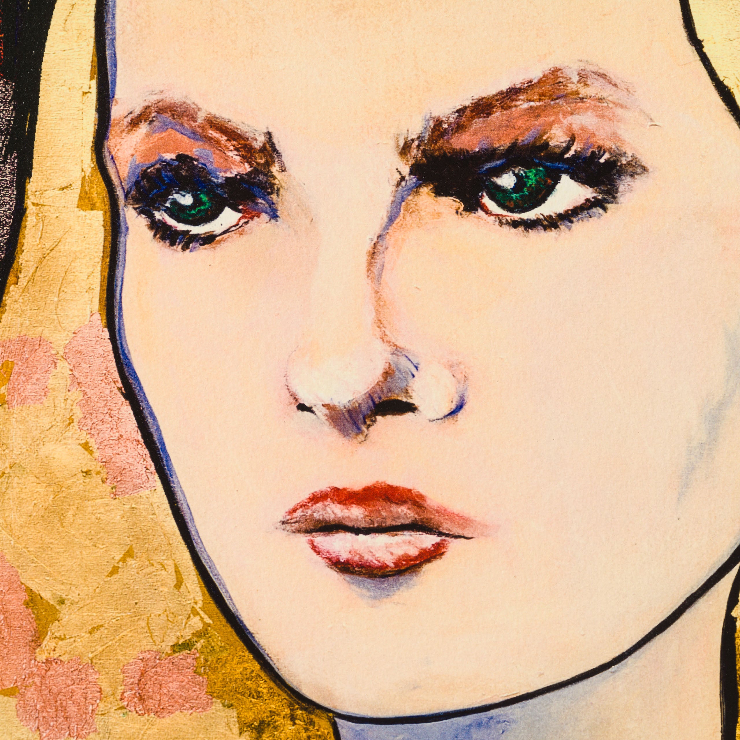 Bold, elegant and regal, this artwork presents a classical figure infused with contemporary flair. Gazing outward with sincere emerald eyes and porcelain-coloured skin, the main figure takes on the appearance of a Medieval princess or a Pre-Raphaelite model with long, flowing gold locks framed by the jewelled crown upon her head. Her refined features have been accentuated by the addition of a bold and calligraphic black line which shapes them.