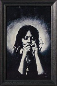 Moving between solitude and unity, each artwork depicts quiet rituals, in this case: a prayer carried in silence – revealing the internal heavy weight of loyalty and authority. Such authority exists in stillness, silence and posture, alongside faith – Jones presents belief as personal and almost demanding, rather than performative or public - an internal compass that must translate into action, responsibility, and compassion. The Birmingham artist invites us into the moments before action - where brotherhood becomes destiny, faith becomes obligation, and power is maintained as much through restraint as through force.