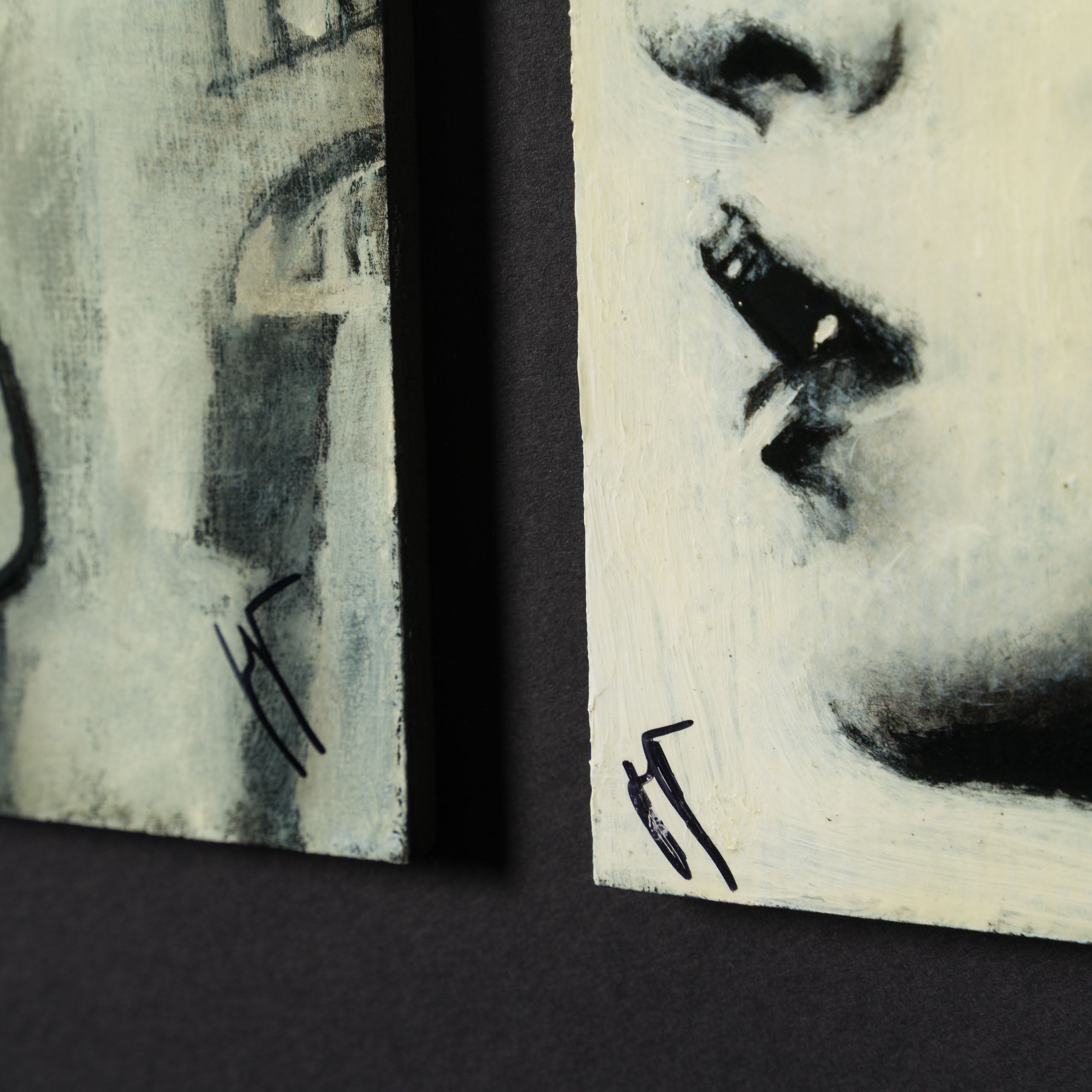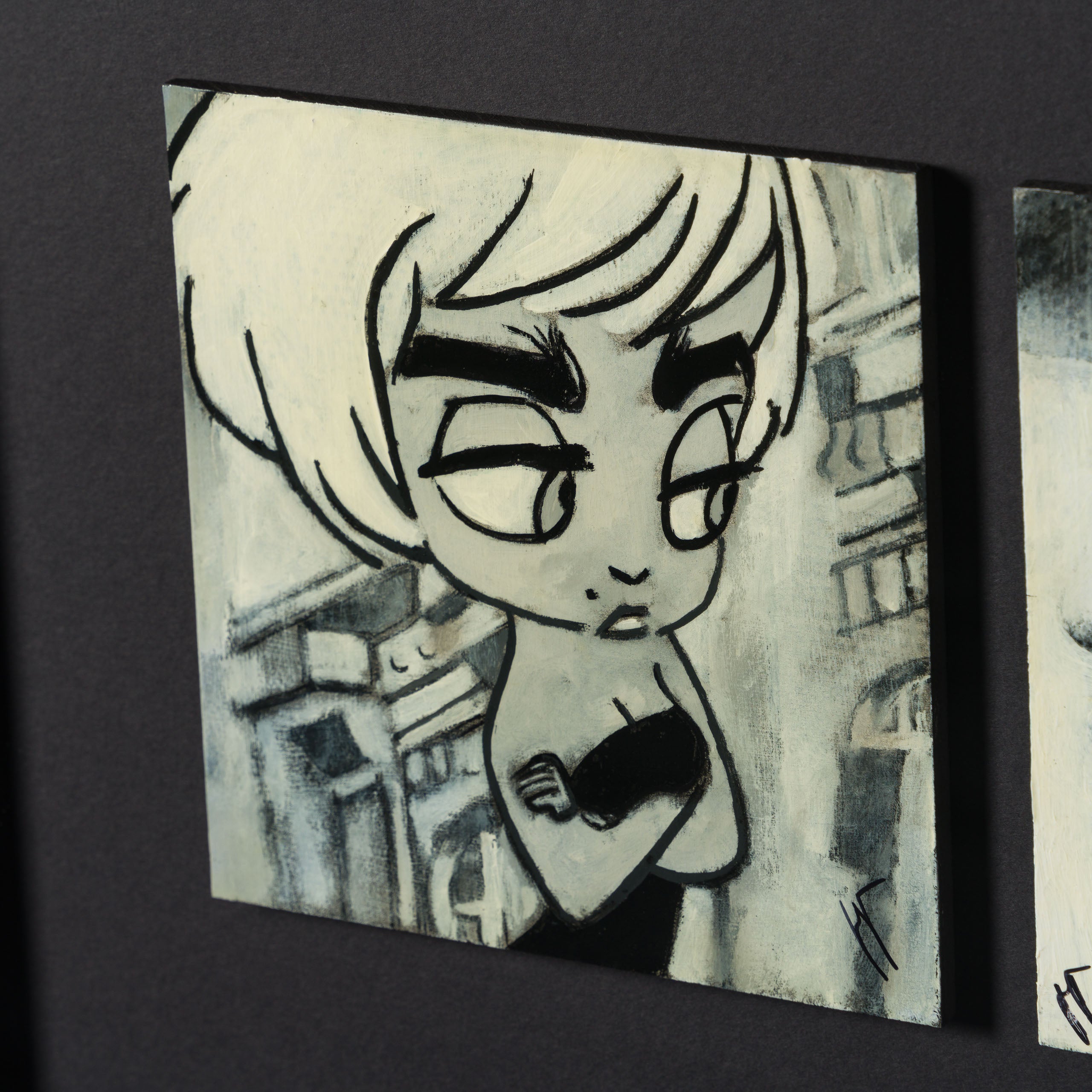 Perplexing, and melancholic, Jon's work is created from the heart, and whilst striving to capture expressions, moods and feelings as a portrait painter, Jon loves the juxtaposition between the portraits with the “animated” portrait, bring a new humour element to the piece. All the individual portraits are from people who have interested or inspired the artist in this case Madonna. The portrait on the left was inspired by the intro of Madonna’s music video “Who’s that girl”. “My first real crush growing up, I remember getting free tickets to watch Desperately Seeking Susan at the Birmingham Odeon, I was mesmerised.”