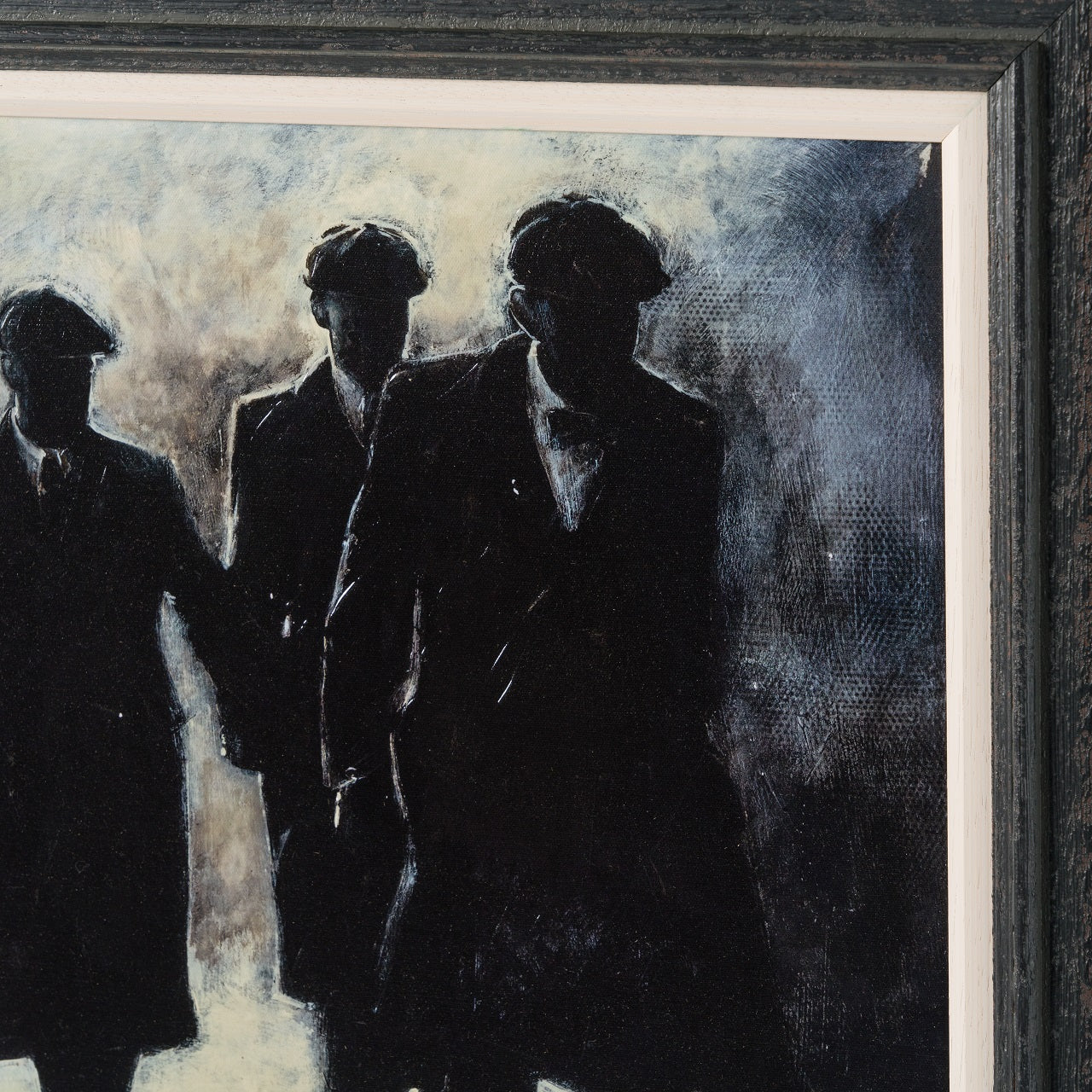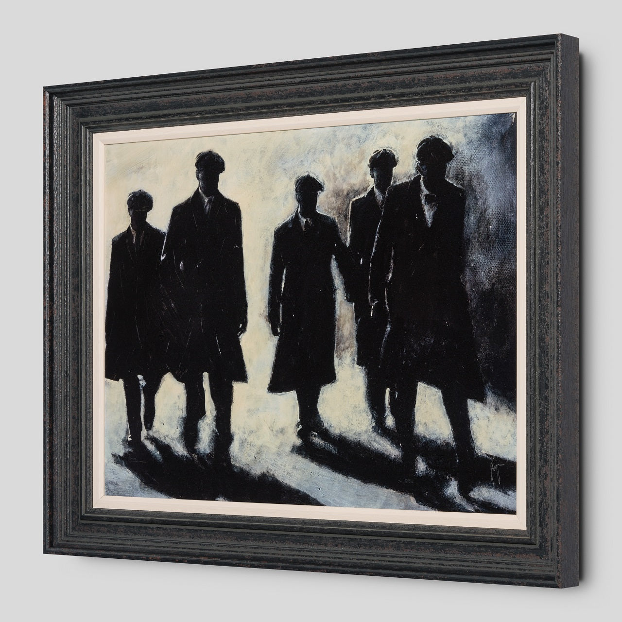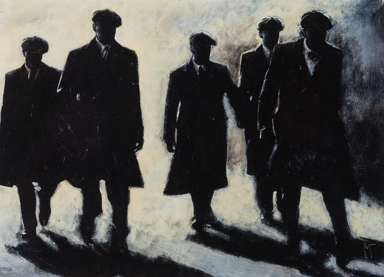 Using conflicting tones of cream white, black and grey to create a highly atmospheric artwork with an essence of realism capturing a monochrome scene. This piece takes inspiration from the Birmingham based gang The Peaky Blinders, bringing us a hand varnished giclee on canvas board.