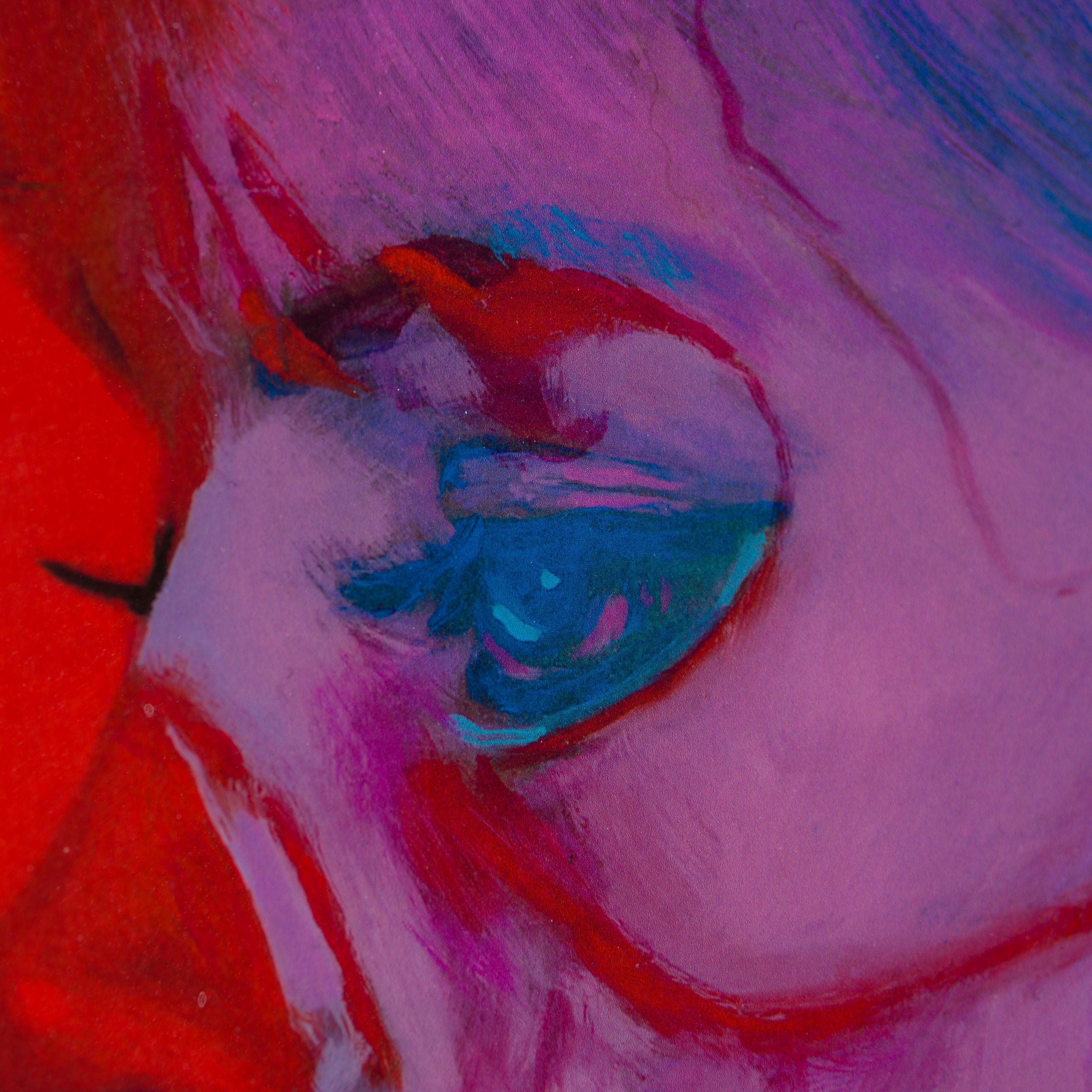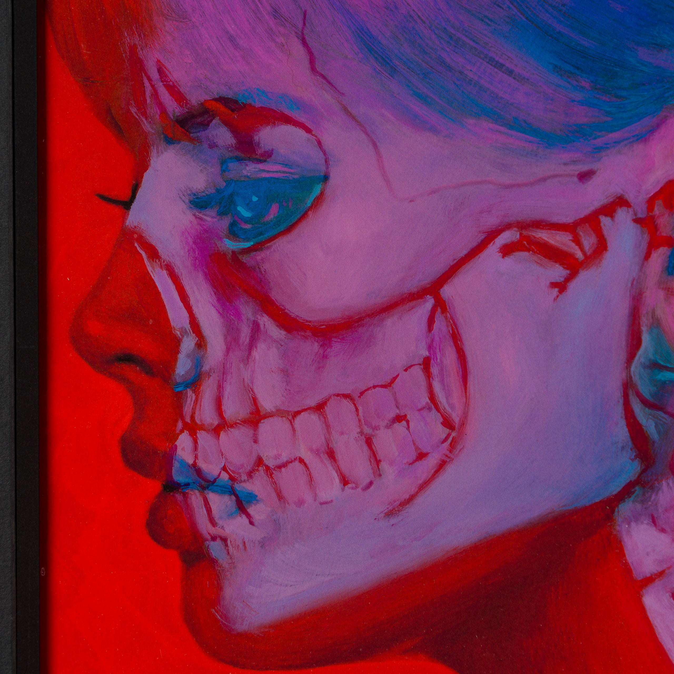 Softly lit and almost translucent, the woman’s face is portrayed floating in the foreground, with her form merging or evolving into the skull. Utilising the anaglyph technique, a practice with the interplay of cyan and red layers, Joseph Jones amplifies the surreal and ethereal atmosphere of the artwork.