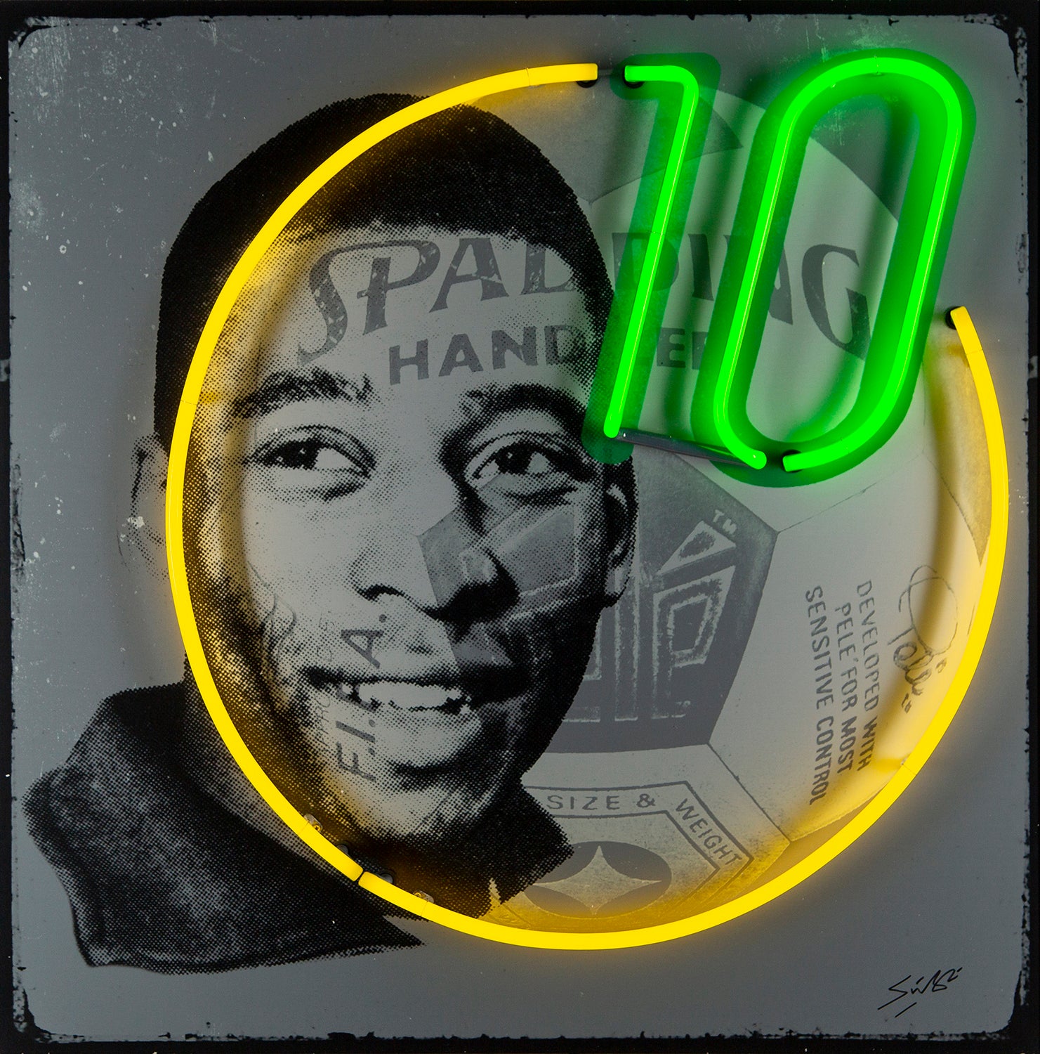 Louis Sidoli's iconic artworks have been exhibited all over the world and bought by such prestigious collectors as Liam Gallagher and Ozzy Osborne. His portraits often utilise authentic photos from popular culture and graphic elements appropriated from a variety of different sources. This dynamic original artwork of Pele features bright pops of electric yellow and green against the monochromatic tones of the portrait and graphic text.
