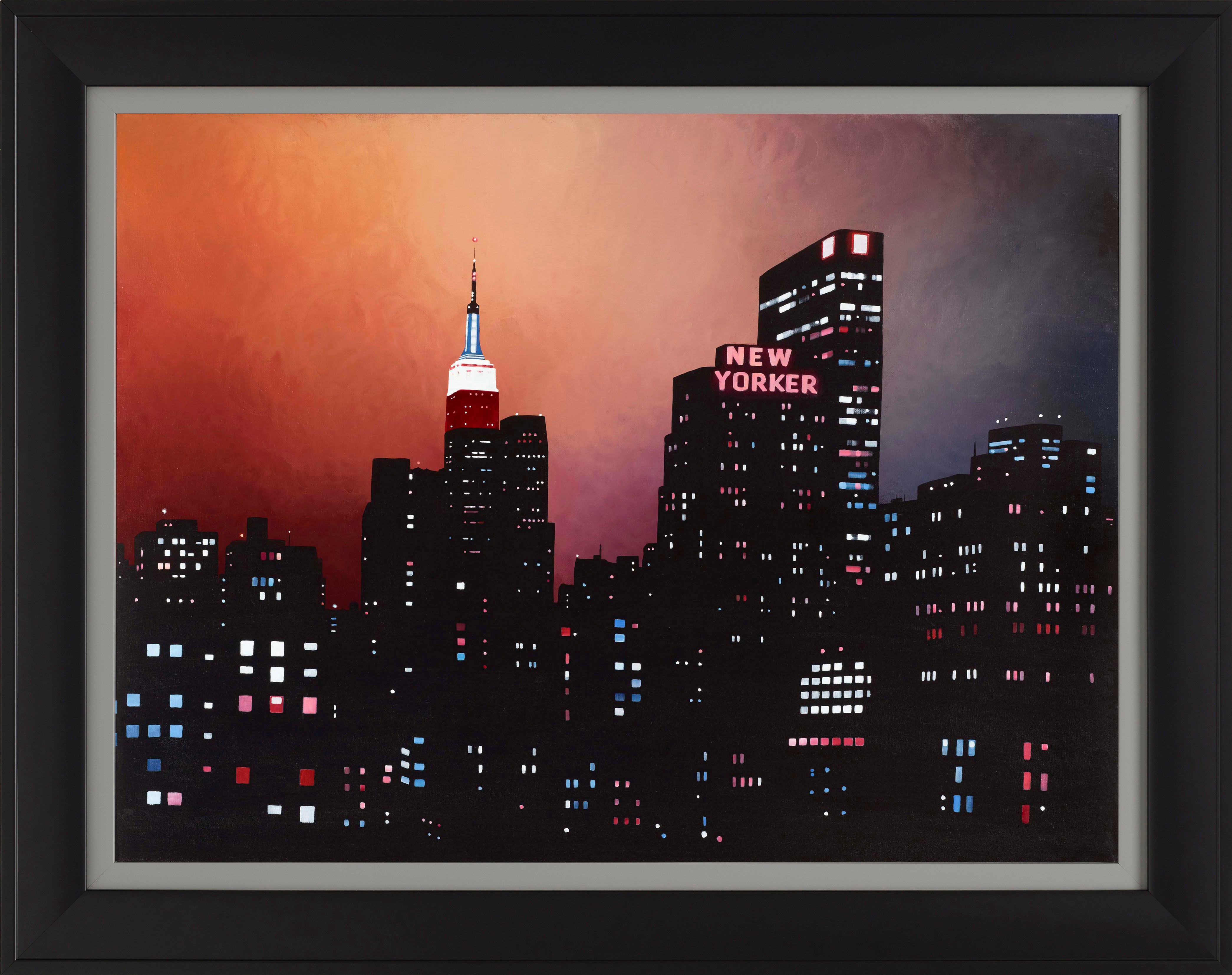 "I first created a moody, atmospheric sky and then painted a silhouette on top of this. I then only used the colours of the US flag, red, white and blue to suggest the buildings and create the twinkling lights of the New York." - Neil Dawson.