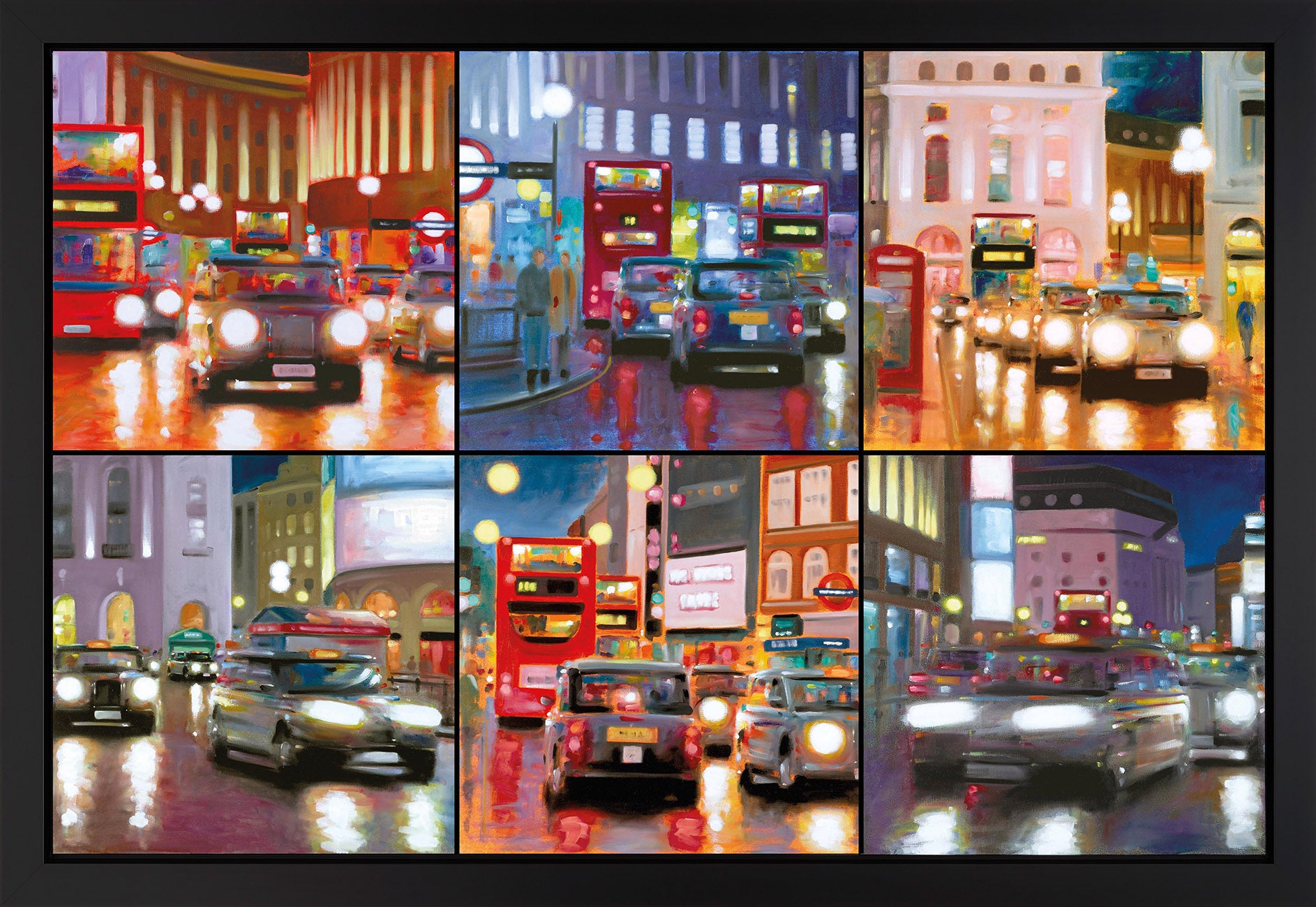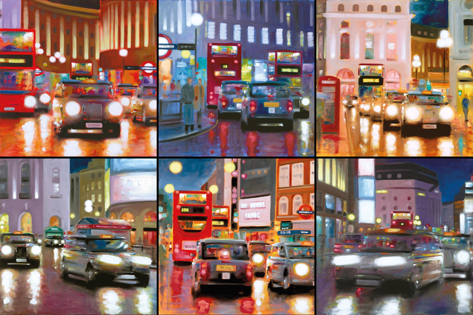 "'Night time in the city' is a mosaic of six individual pictures. Together, I wanted the paintings to describe a busy and exciting adventure in London. London after dark is an enthralling playground, and a night in the city is a multi-sensory and multi-faceted experience which. I hope the collage brings to life." - Neil Dawson.