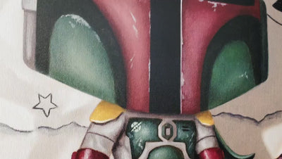 Framed in elegant black and gold ayous wood, this otherworldly artwork by Nigel Humphries captures one of the most iconic characters from the Star Wars saga! Boba Fett's appearance on screen is small but impactful and the artist wanted to capture the character's unique appearance including his scratched and battle worn helmet and armour.