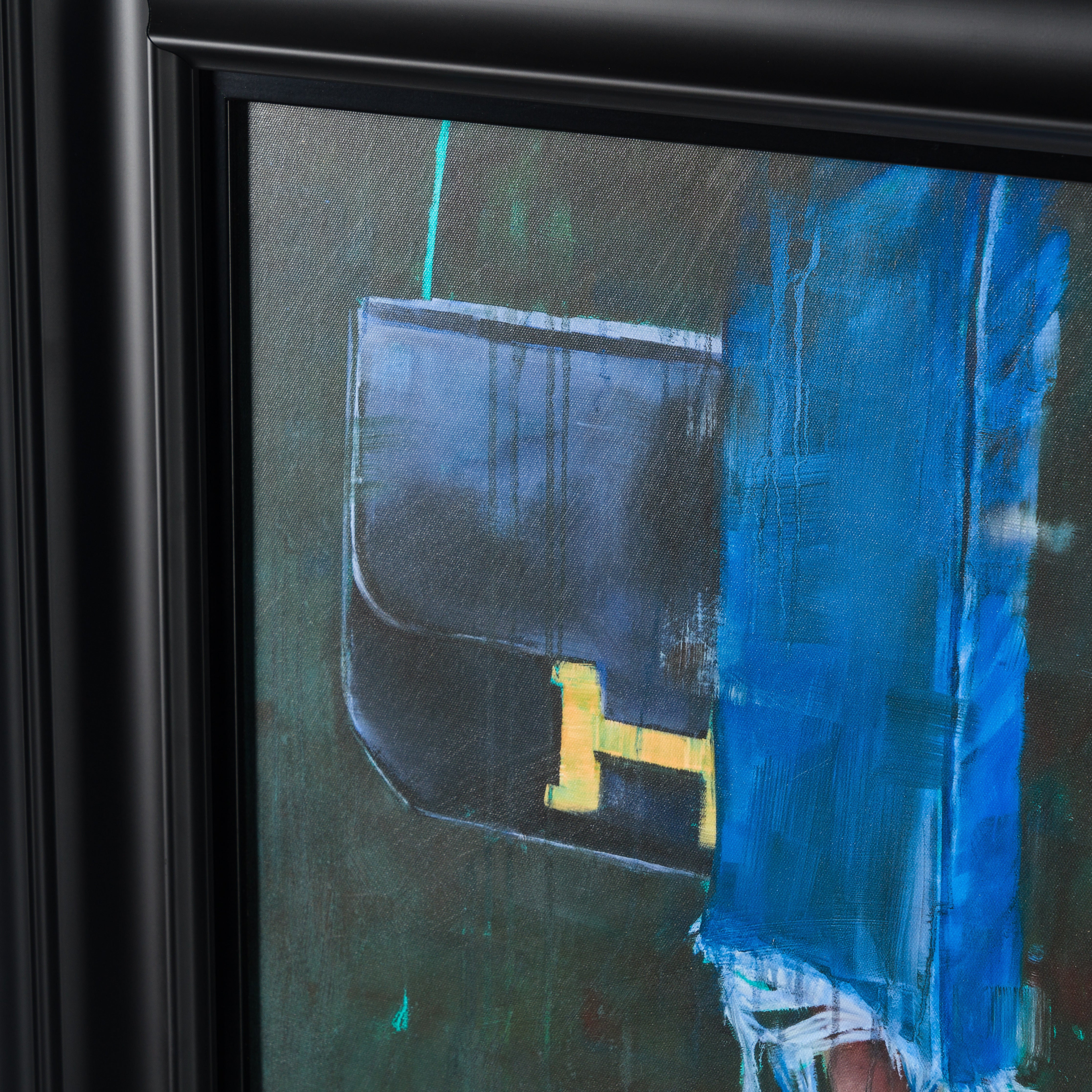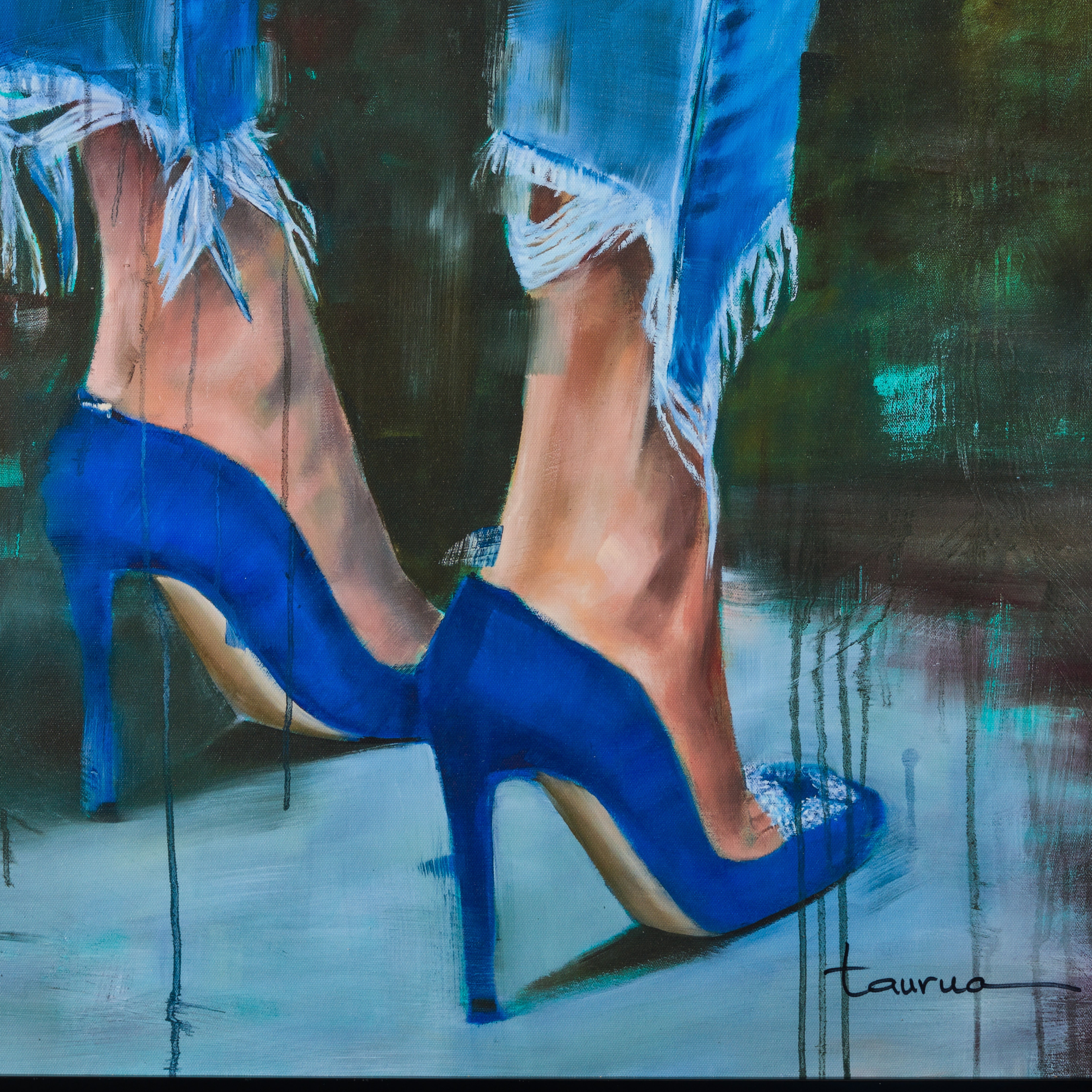 A playful mix of vivid and subdued tones drip down the canvas in this signed limited edition artwork by Pascale Taurua. We see delicate, frayed strands of denim hover above dainty ankles adorned with the classic blue Manolo Blanik ‘Hangisi’ shoes made famous by TV show and film ‘Sex and the City’. Next to them, swings a beautifully portrayed Hermès ‘Constance’ bag, designed in the 1967 and characterised by a simple yet effective ‘H’ clasp. A bold mix of contemporary fashion with classic glamour, this artwork will add an exciting pop of colour and style to any space.
