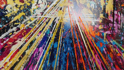 Recognized for his distinctive style which often incorporates neon tones to create glowing elements, metallic paints to enhance the shimmering tones, bold colours, energetic mark making to capture the vibrant atmospheres and, by adding layers of paints, texture which plays a crucial role in adding depth to the vibrant pieces.