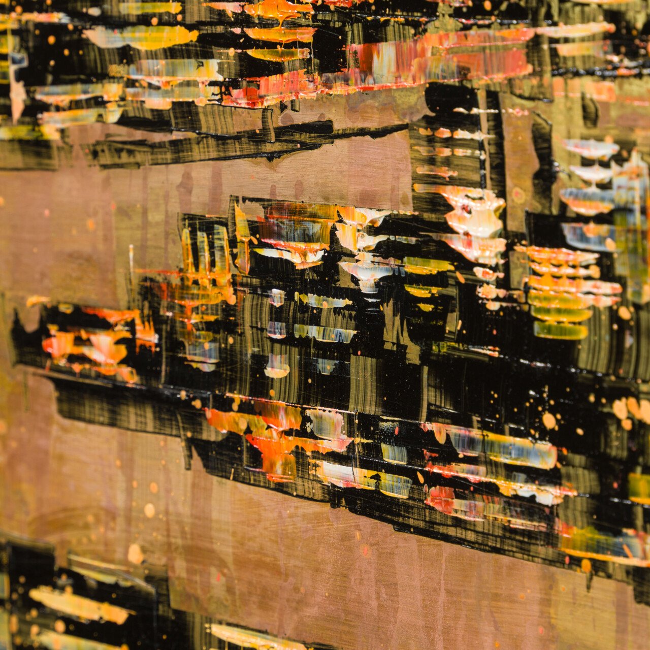 Through his use of rich colours and raw textures, Kenton captures the contemporary allure yet underlying intensity of urban life, implying the sounds, smells and atmosphere that surround the scene.