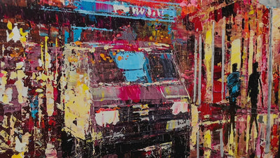 Through his use of rich colours and raw textures, Kenton captures the contemporary allure yet underlying intensity of urban life, implying the sounds, smells and atmosphere that surround the scene.