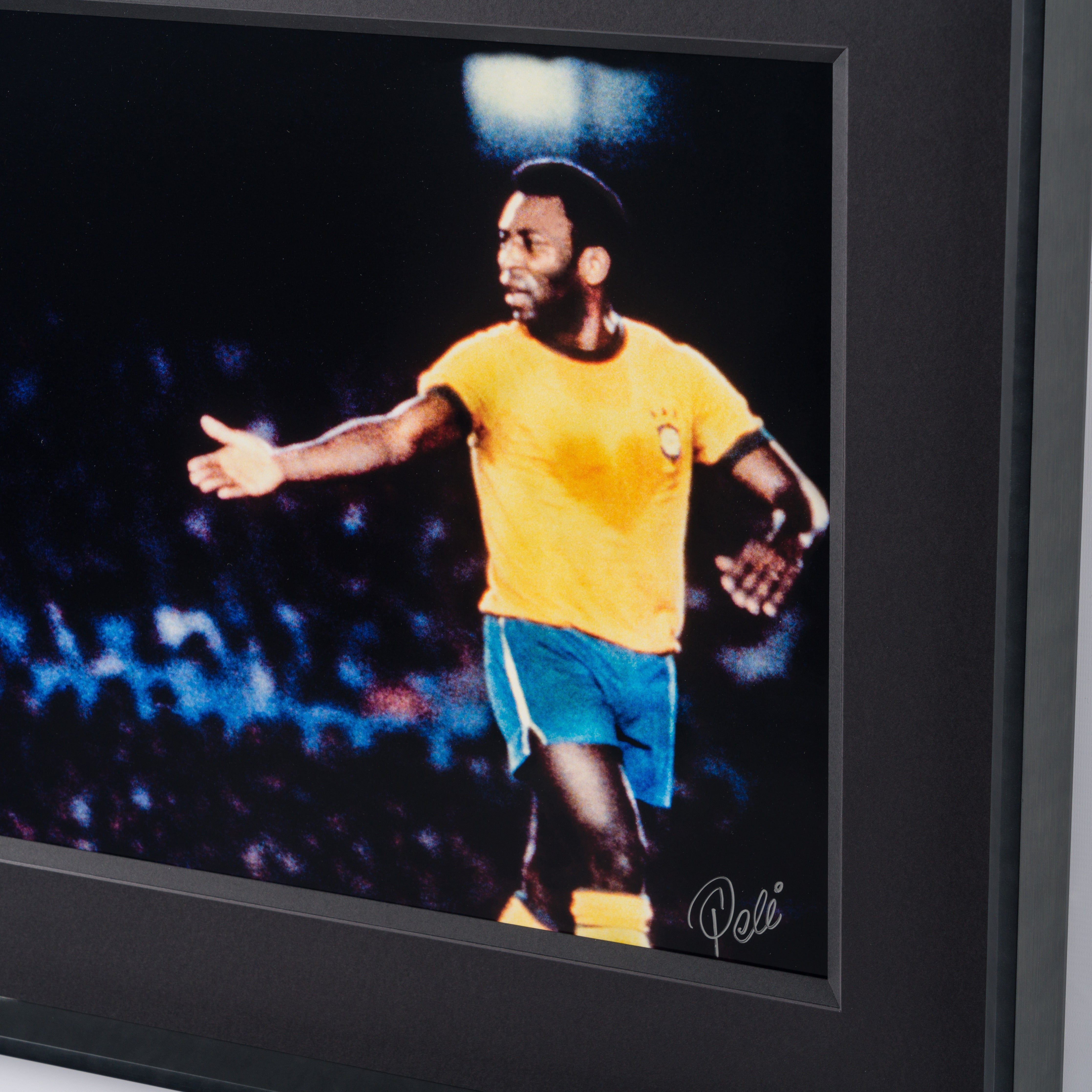 Named ‘Football Player of the Century’ by FIFA, Pelé is one of the most celebrated football players in history. The only man to win the World Cup three times, the Brazilian footballer had tremendous vision and an electrifying pace, having set numerous records at international level. Hand-signed by Pelé himself, this captivating photograph captures not only his skills on the field and as a player, but the passion and humility of the man behind the legend.