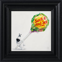 Across the collection, familiar British classics, in this case Chupa Chups are reimagined with the Smiths’ hyper-realist precision. Peters’ refined oil technique gives each wrapper a tactile presence so convincing it appears almost peelable, while the clean compositions maintain a crisp contemporary elegance perfectly suited to modern interiors.