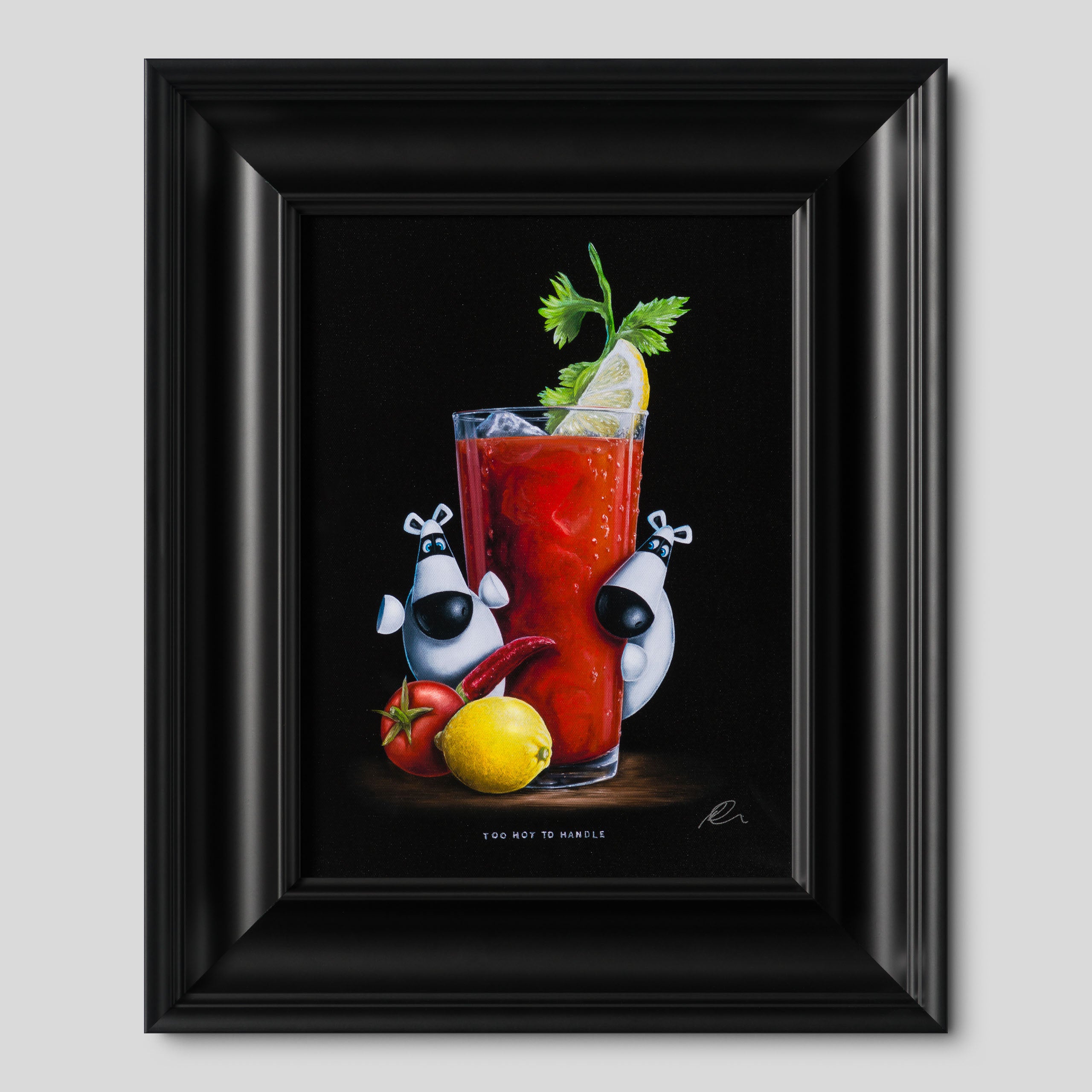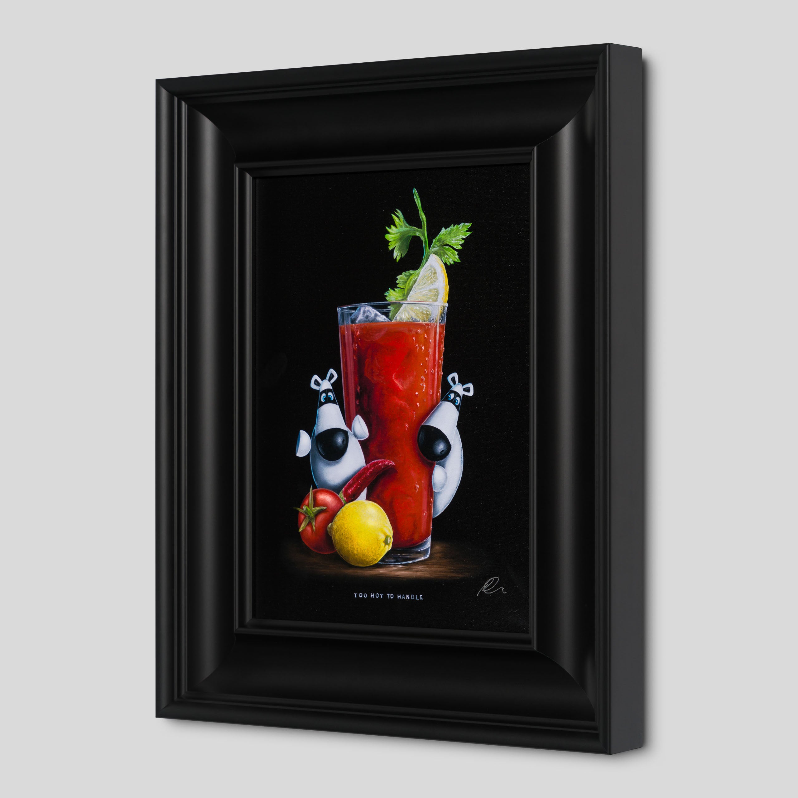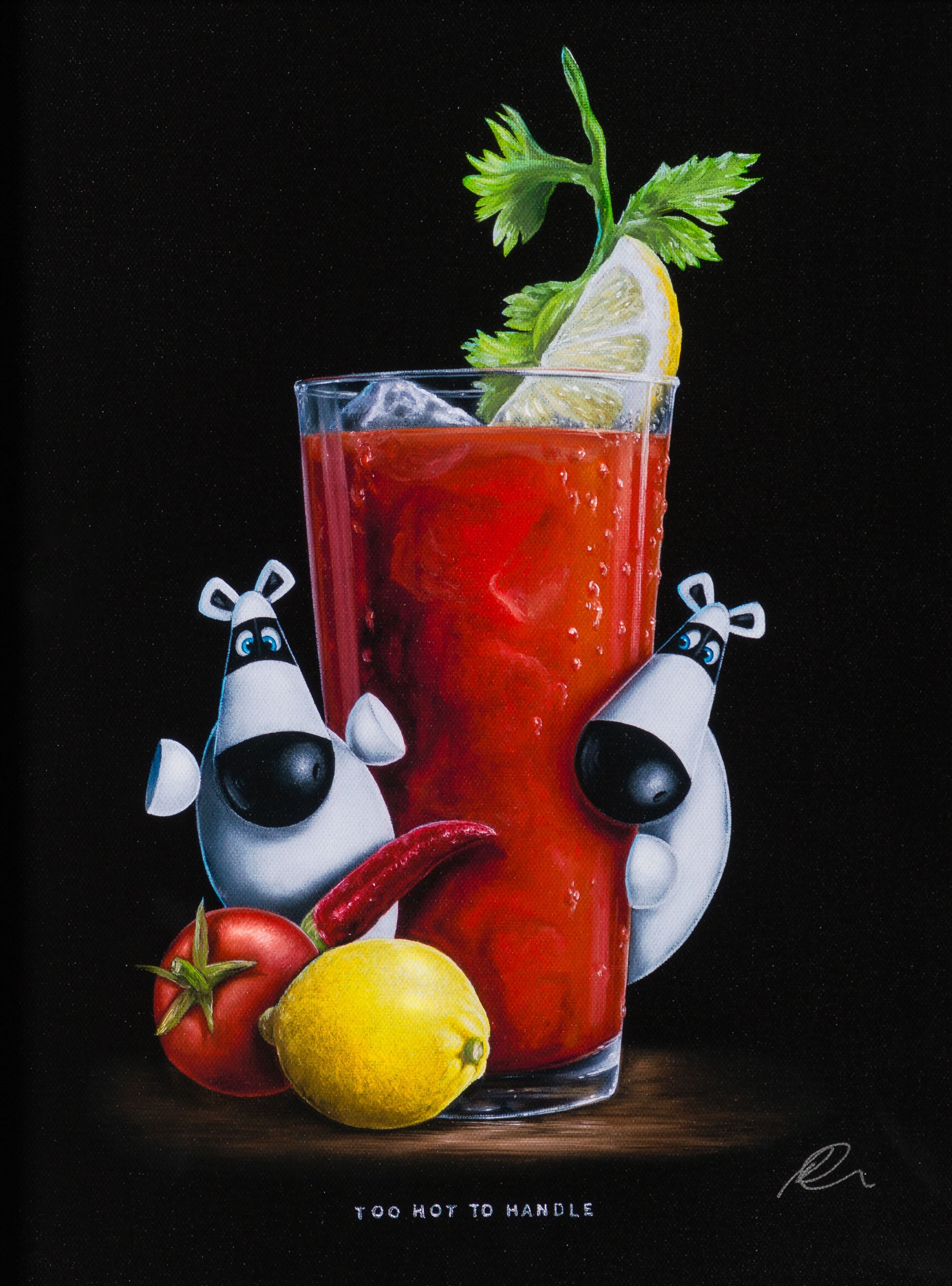 In a traditional still-life composition creating a visually appealing and balanced image, the “Too Hot To Handle” is vignetted by a classic and simple black background. The bold colour is incredibly punchy, completely focussing the attention on the tantalising tipple and scene at hand. Ever a fine artist, this piece has been painted in vivid oil paint with the incredible craftsmanship we have come to expect from skilled still-life painter, Peter Smith. The piece shows the duo’s brilliant artistry given the complexity of the composition – the beverage which is instantly recognisable, the Impossimal positions carrying the visual humour and the title to pull everything together.