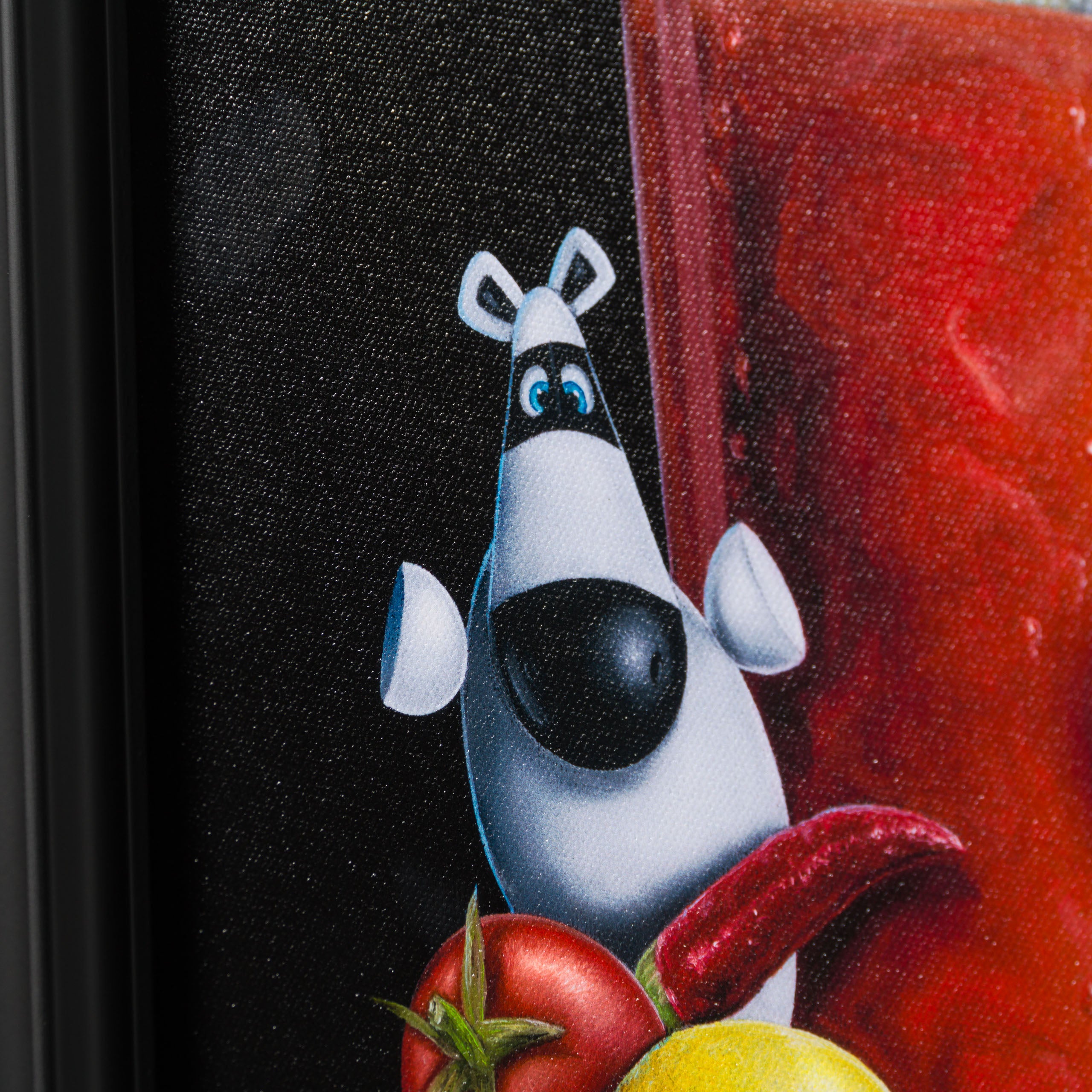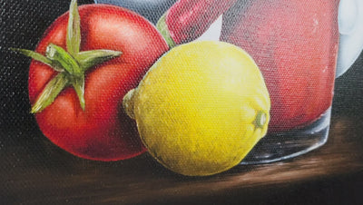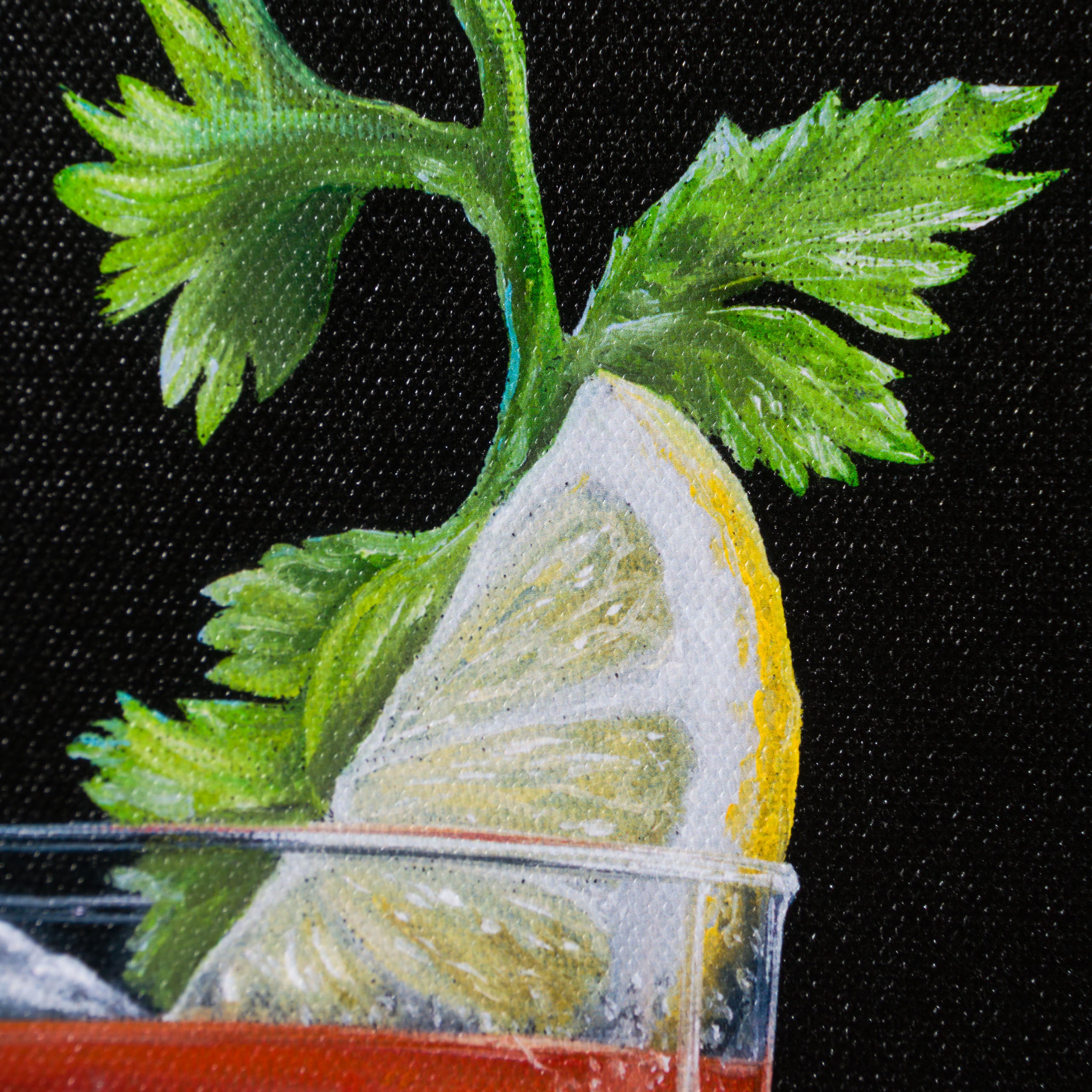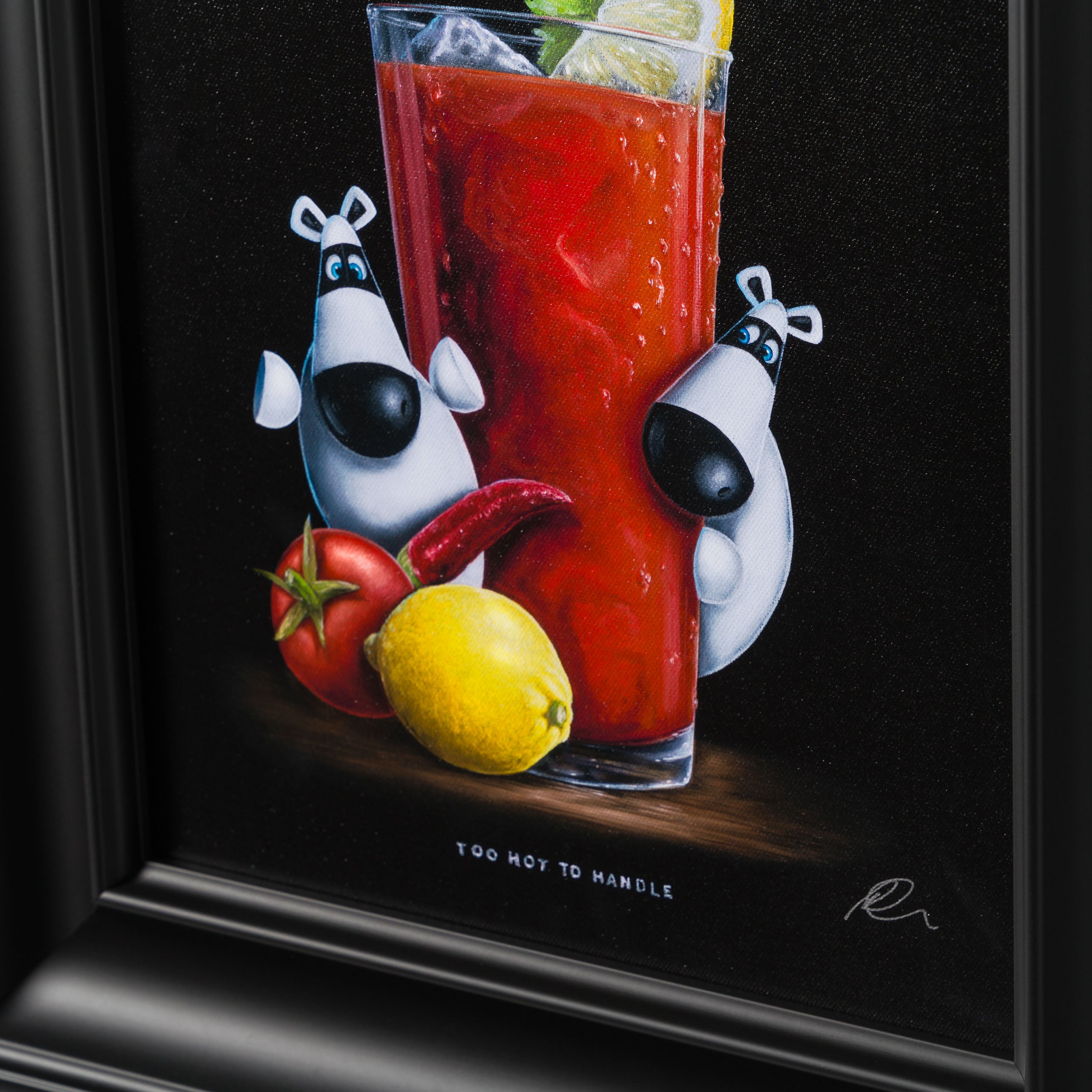 In a traditional still-life composition creating a visually appealing and balanced image, the “Too Hot To Handle” is vignetted by a classic and simple black background. The bold colour is incredibly punchy, completely focussing the attention on the tantalising tipple and scene at hand. Ever a fine artist, this piece has been painted in vivid oil paint with the incredible craftsmanship we have come to expect from skilled still-life painter, Peter Smith. The piece shows the duo’s brilliant artistry given the complexity of the composition – the beverage which is instantly recognisable, the Impossimal positions carrying the visual humour and the title to pull everything together.