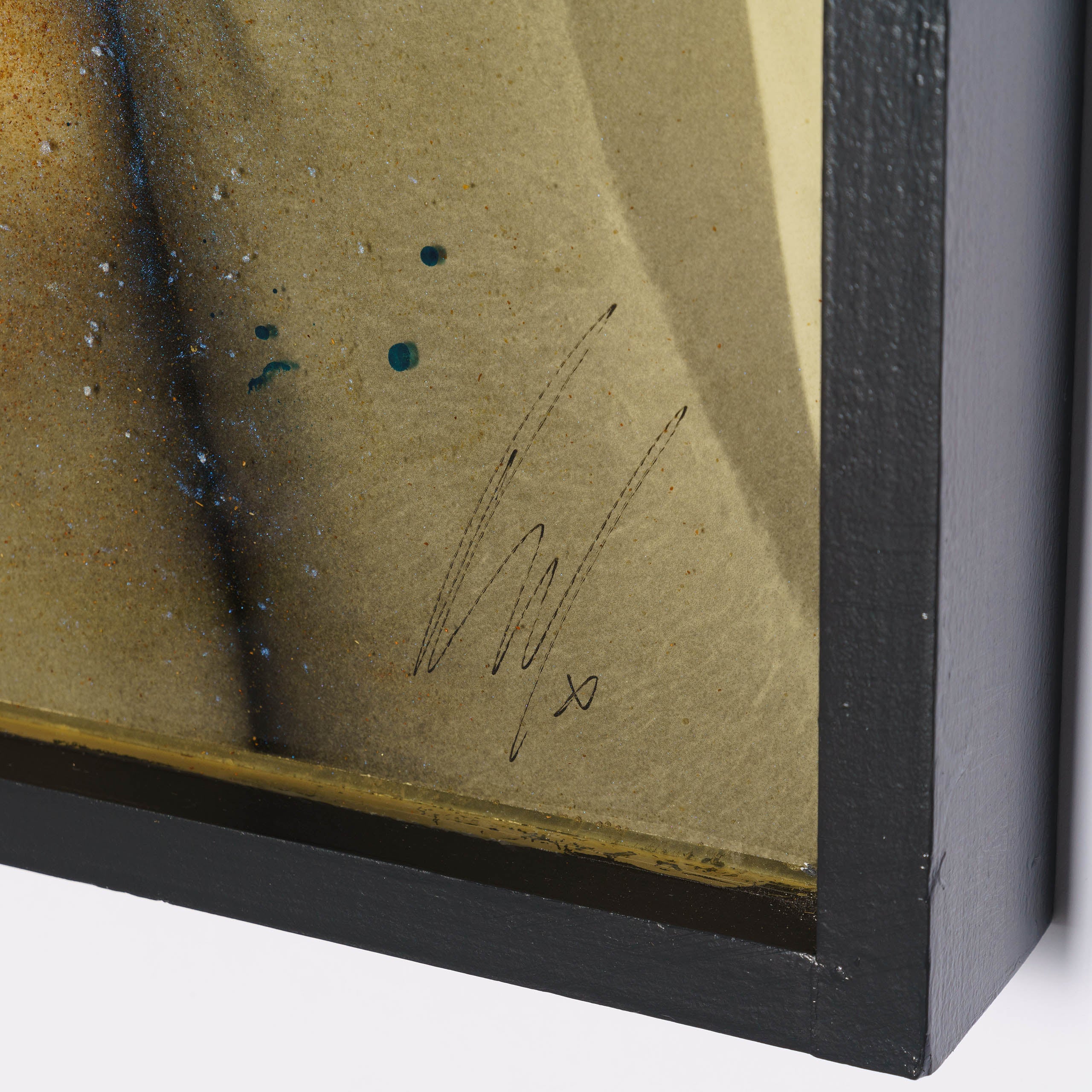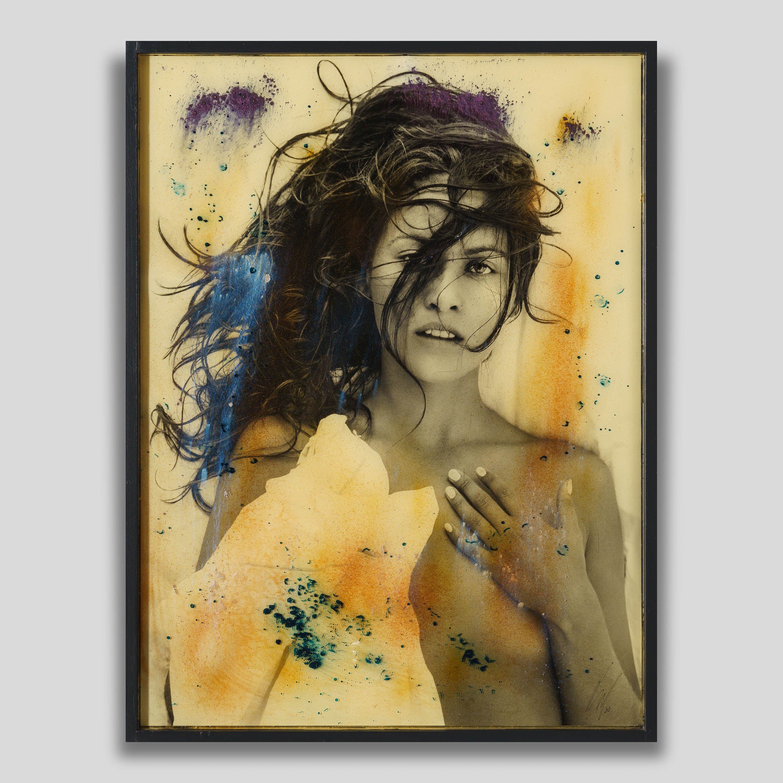 In this gorgeously textured mixed media and resin artwork by Raphael Mazzucco, we see soft tones of cream and pasted oranges offset by passionate accents of deep blue and purple. Exploring the art historical figure of the female nude through a contemporary lens, Raphael Mazzucco also amalgamates a range of artistic mediums including paint and photography