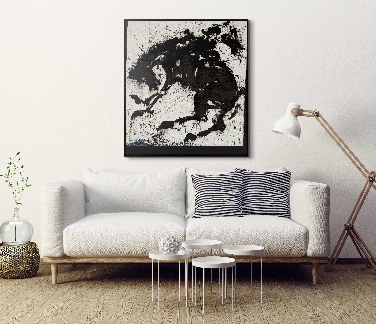 An image of intense movement and fury, Richard Hambleton's painting 'Tribeca Rider' was painted shortly before his withdrawal from the limelight of the art world. The world-famous artist, whose immense dedication to his art saw him live between the highest circles of the art world and depths of poverty, exchanged this artwork for food in the restaurant in Tribeca where he ate daily. Thrown between these two extremes, the artist’s turbulent life and state of mind can also be seen in the highly emotional painting of the Tribeca rider; grappling with the violence of his horse, barely visible through the gestures of frenetic movement.
