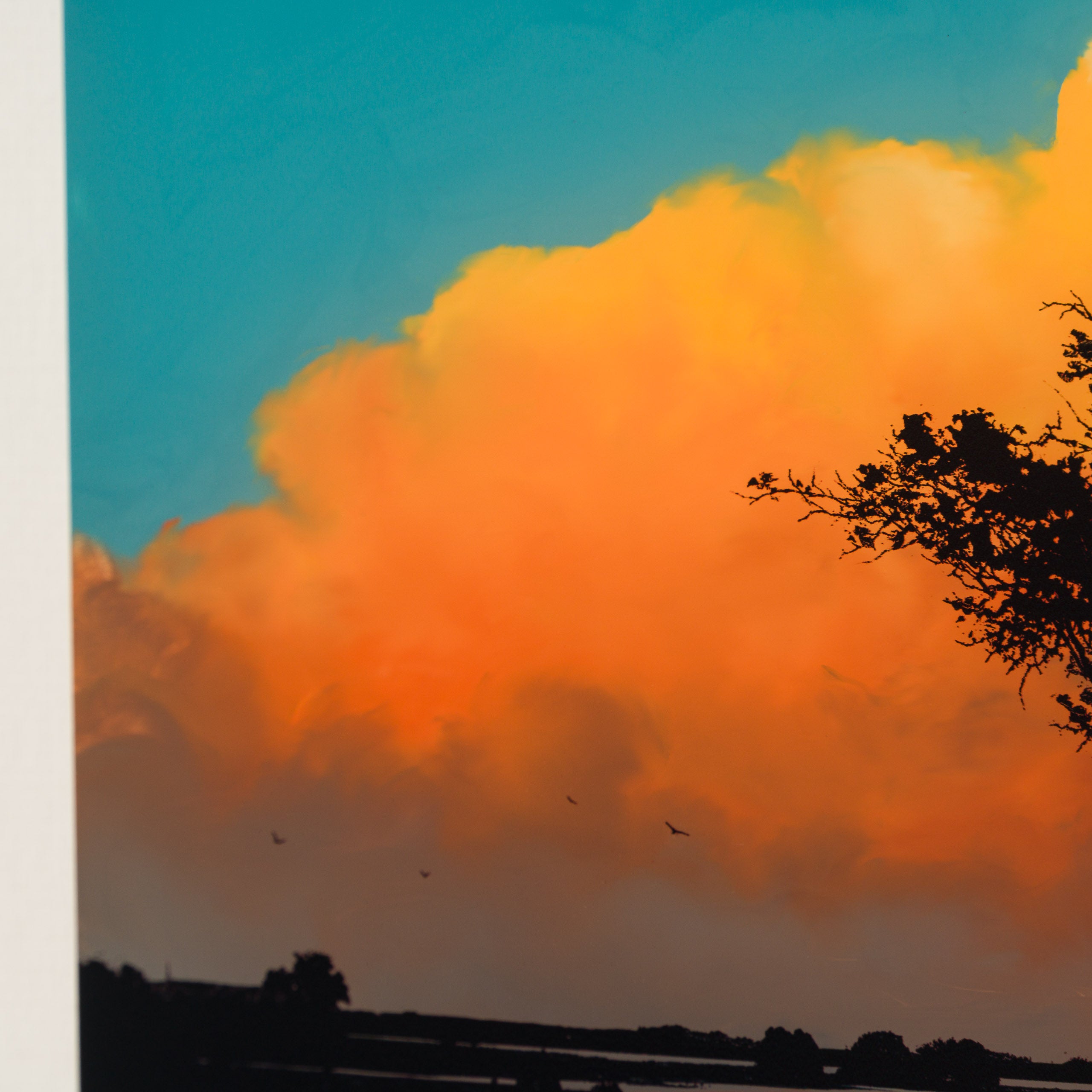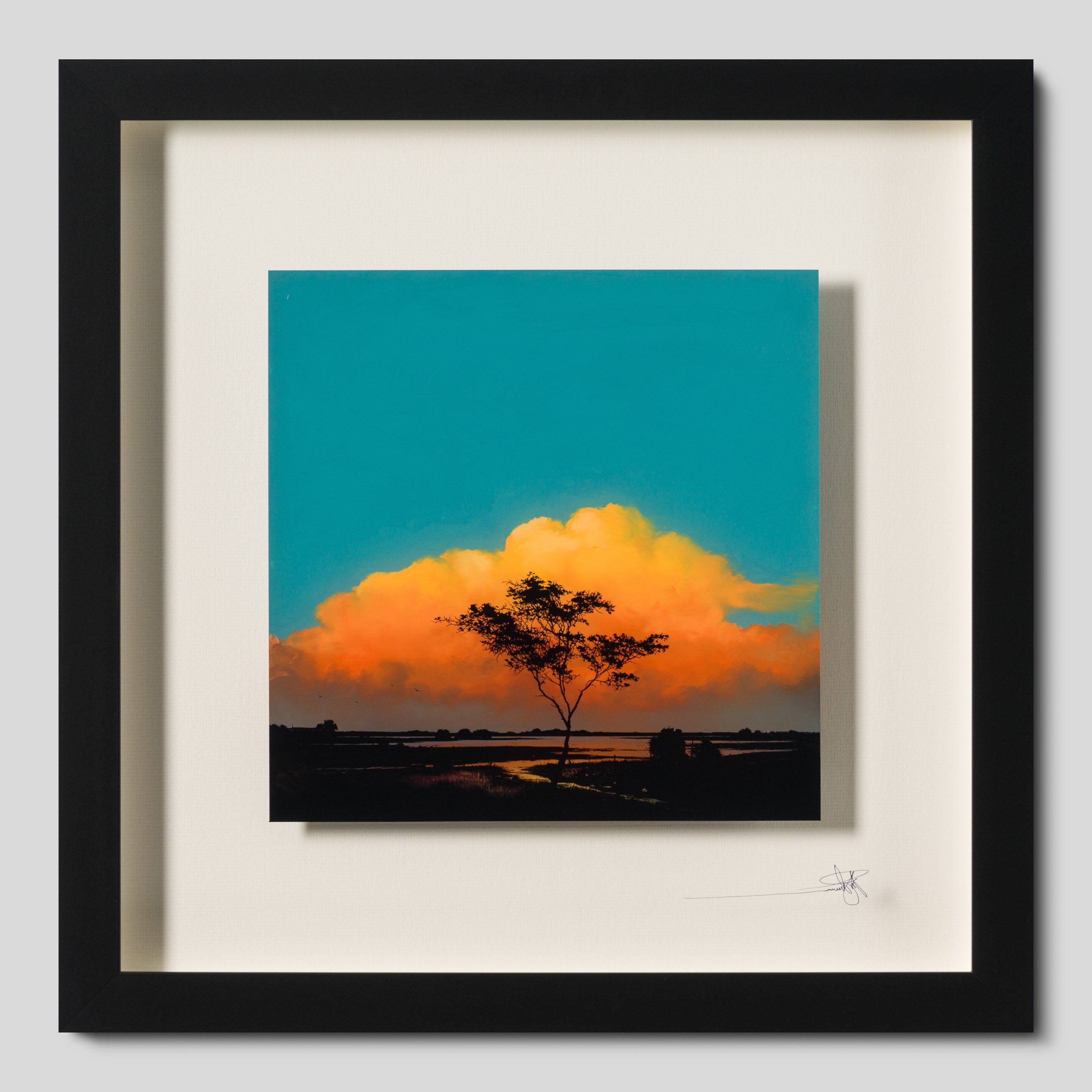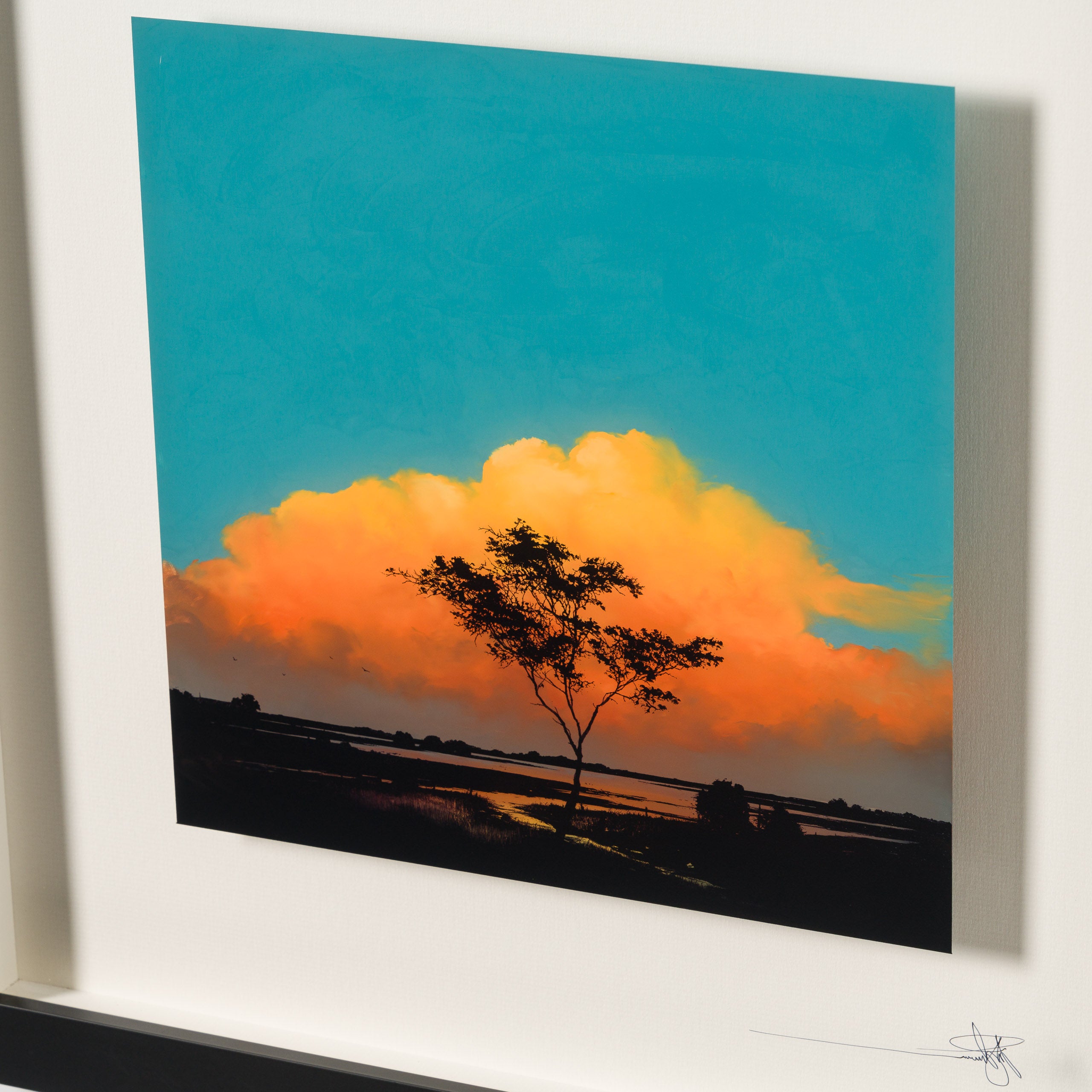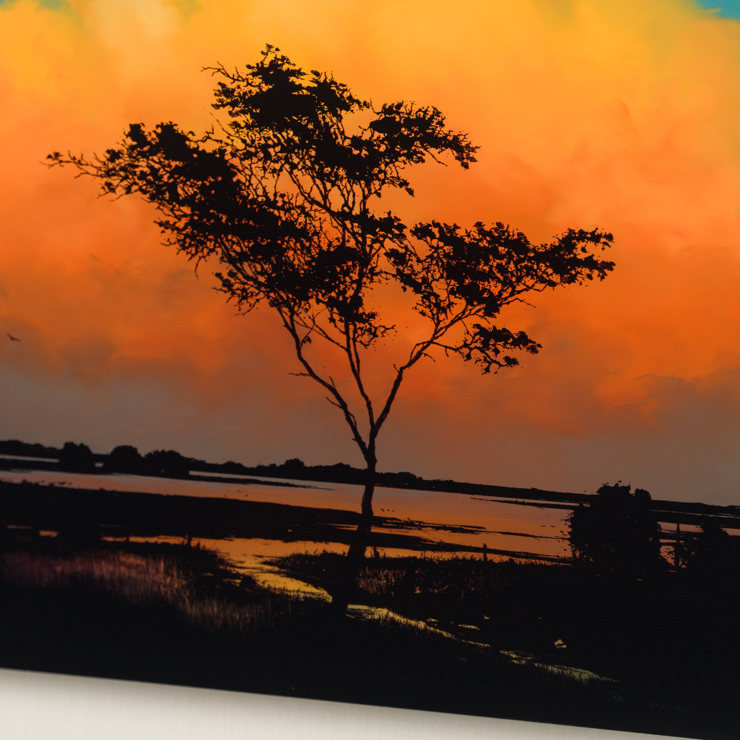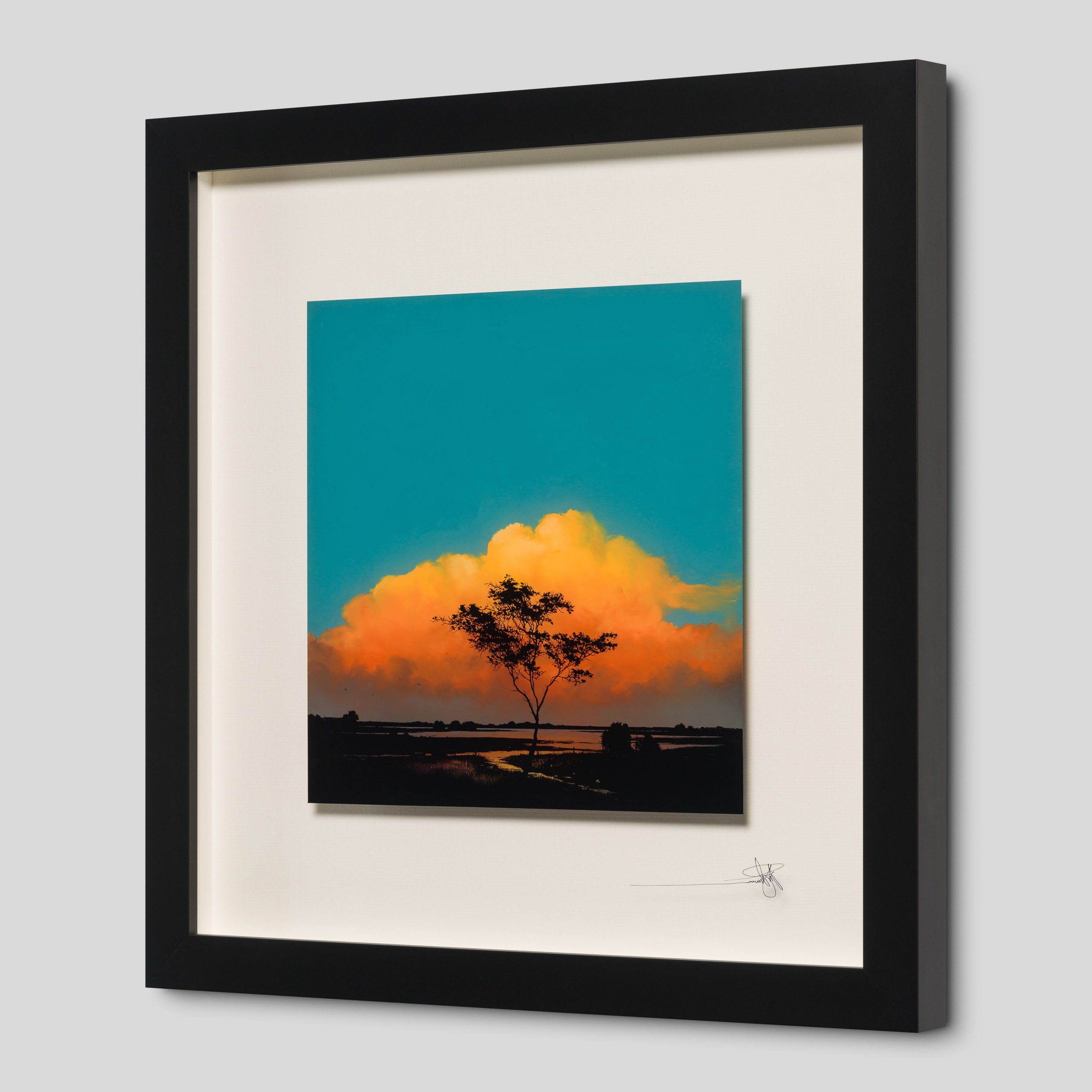 A pioneer of reverse painting on glass Richard Rowan has created an atmospheric scene that allows us to escape from everyday life and take notice of the changing possibilities of nature. The sky takes full stage, framing the detailed silhouette of the tree with an incredible gradience of colour and depth.