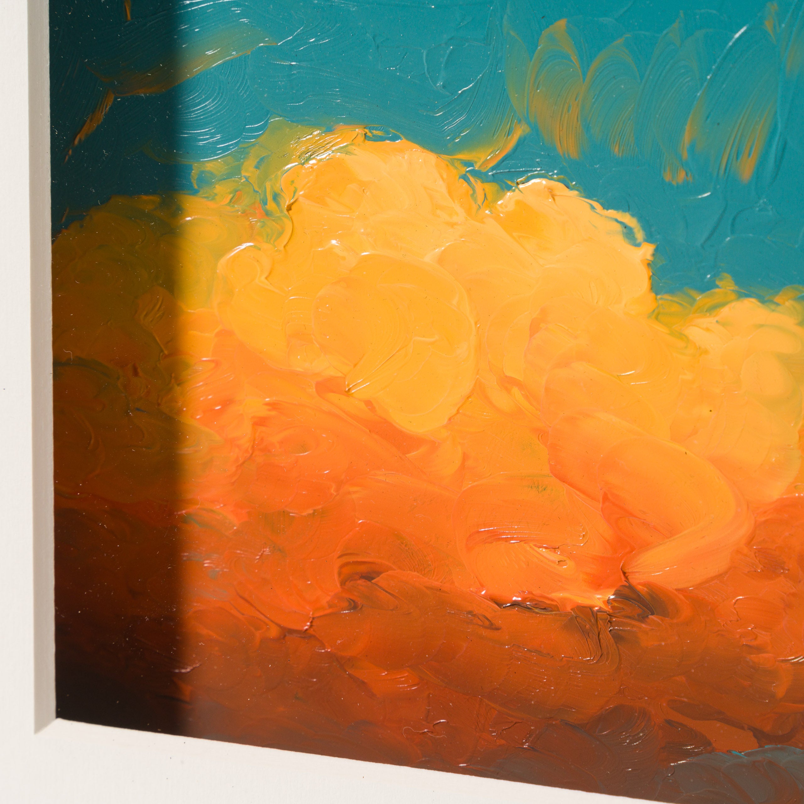 With bright blue and orange hues, ‘Journey Beyond XXIV’ is a vivid sunset landscape, evoking a sense of grandiosity and calm, highlighted by its reflection in the water.