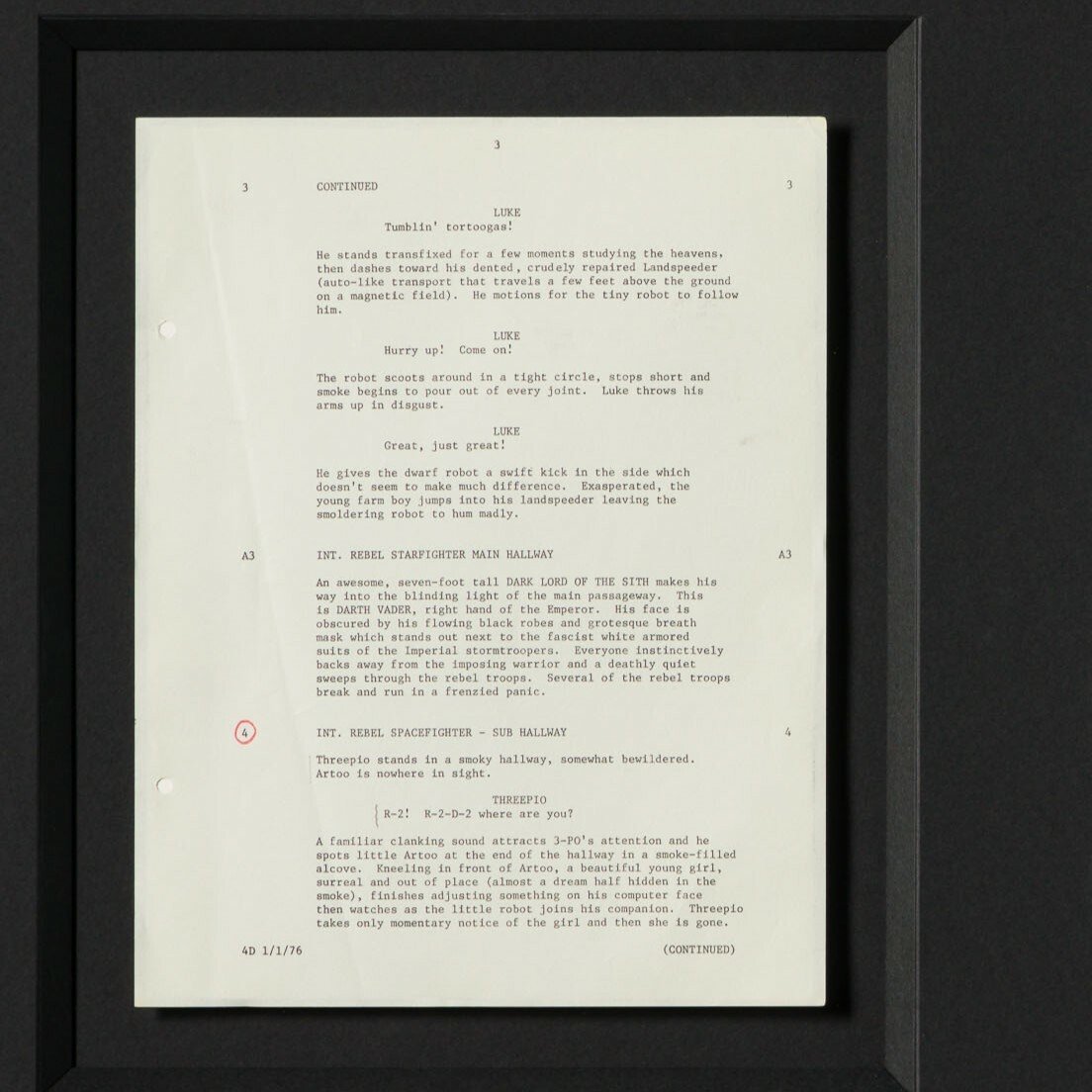 His 145-page draft script, credited to Lucas, is dated January 1, 1976. The visibly worn title page has Daniels' name stamped on it and features the title “Star Wars”.