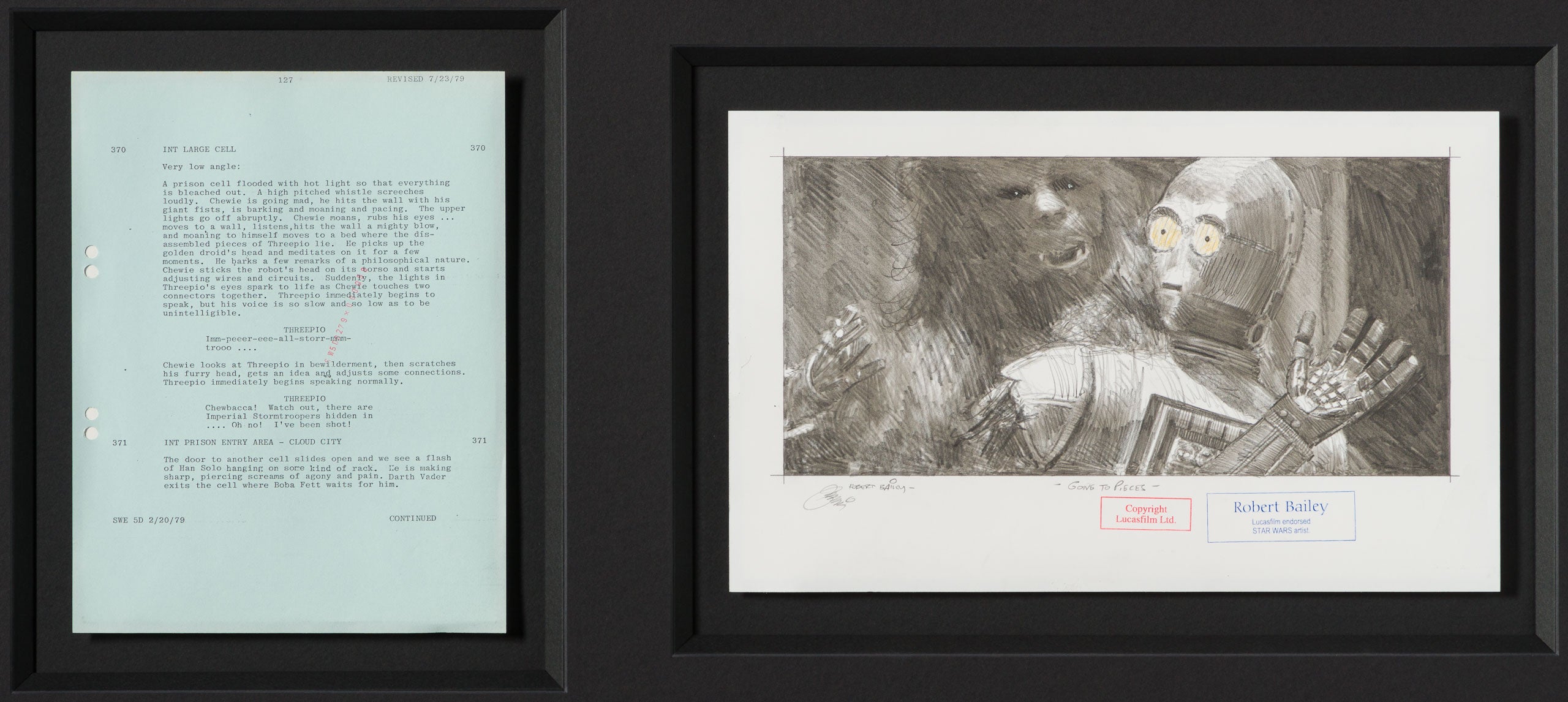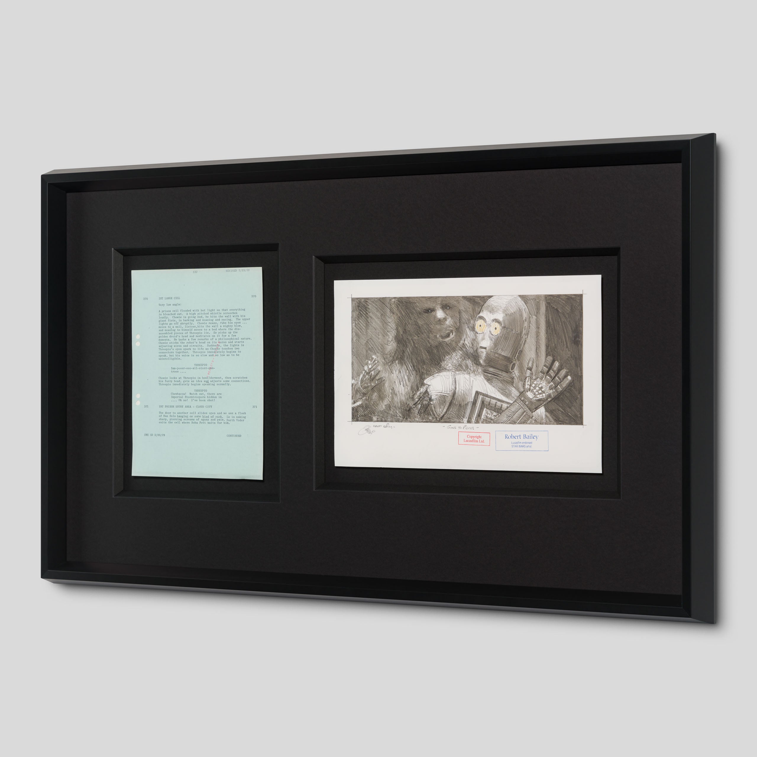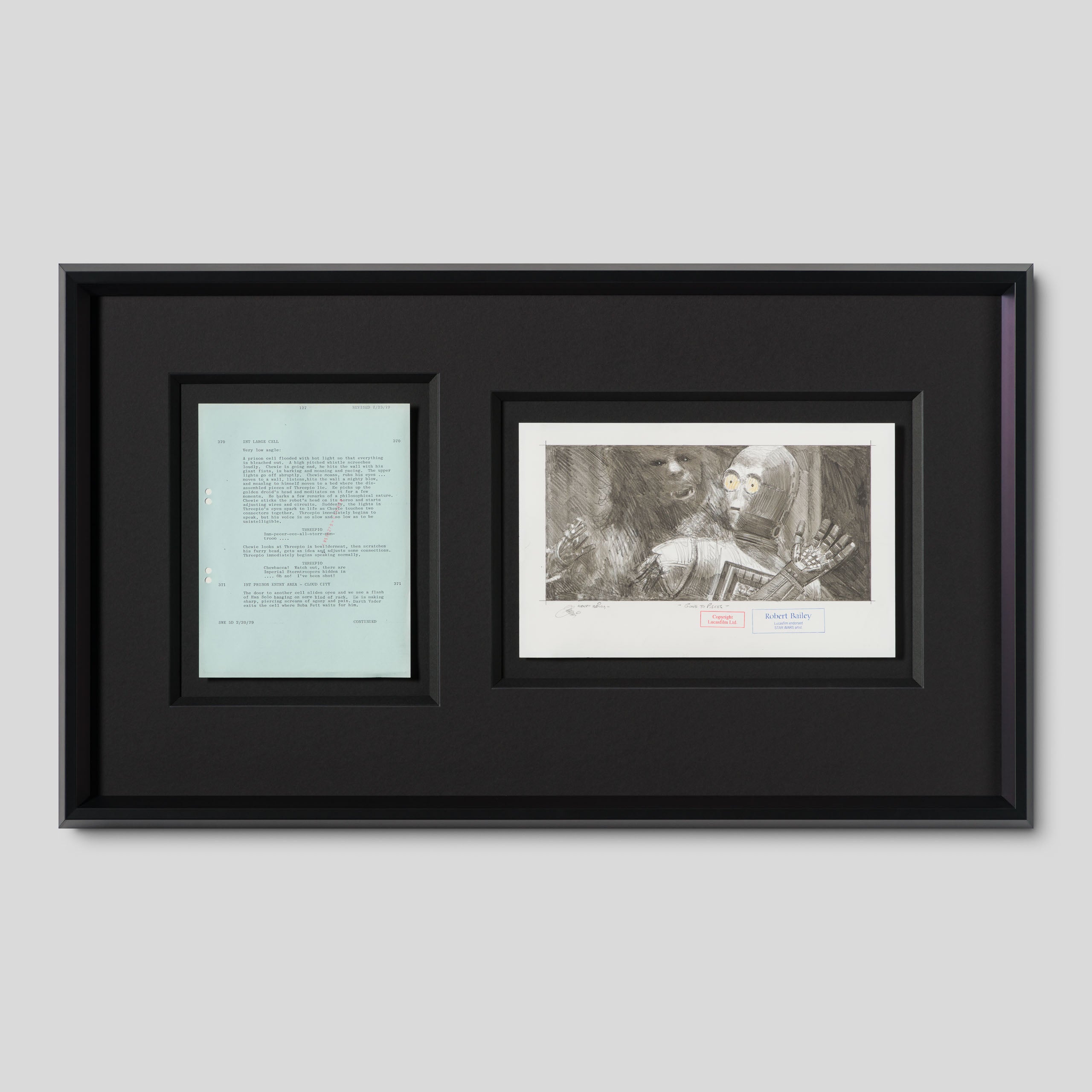 Alongside a script page, Bailey captures the essence of the iconic scene and allows collectors to own a real piece of Star Wars history. “Gone to Pieces” features an unforgettable drawing of C-3PO and Chewbacca with page number 127 of the script. The script has 5 different coloured pages throughout the pages, which shows the changes between each edit that would have happened through the process of creating the film – in this case the blue pages are from a revision on 23rd July 1979 & 22 August 1979.