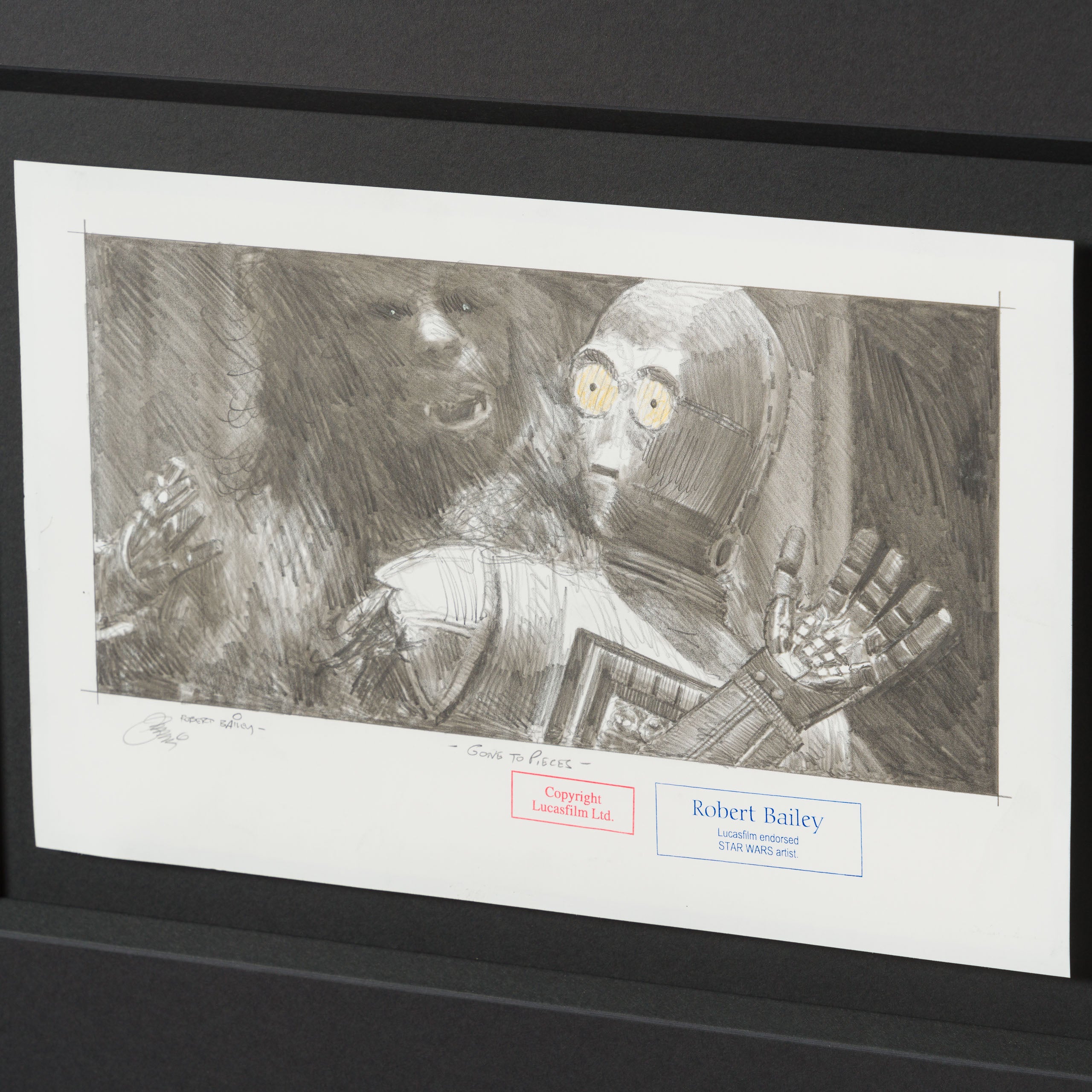 This piece is in museum glass. Alongside Robert Bailey’s signature, every piece has two different coloured stamps: a red stamp for the copyrights of Lucasfilm and a blue stamp for mark Bailey as a Lucasfilm endorsed artist.