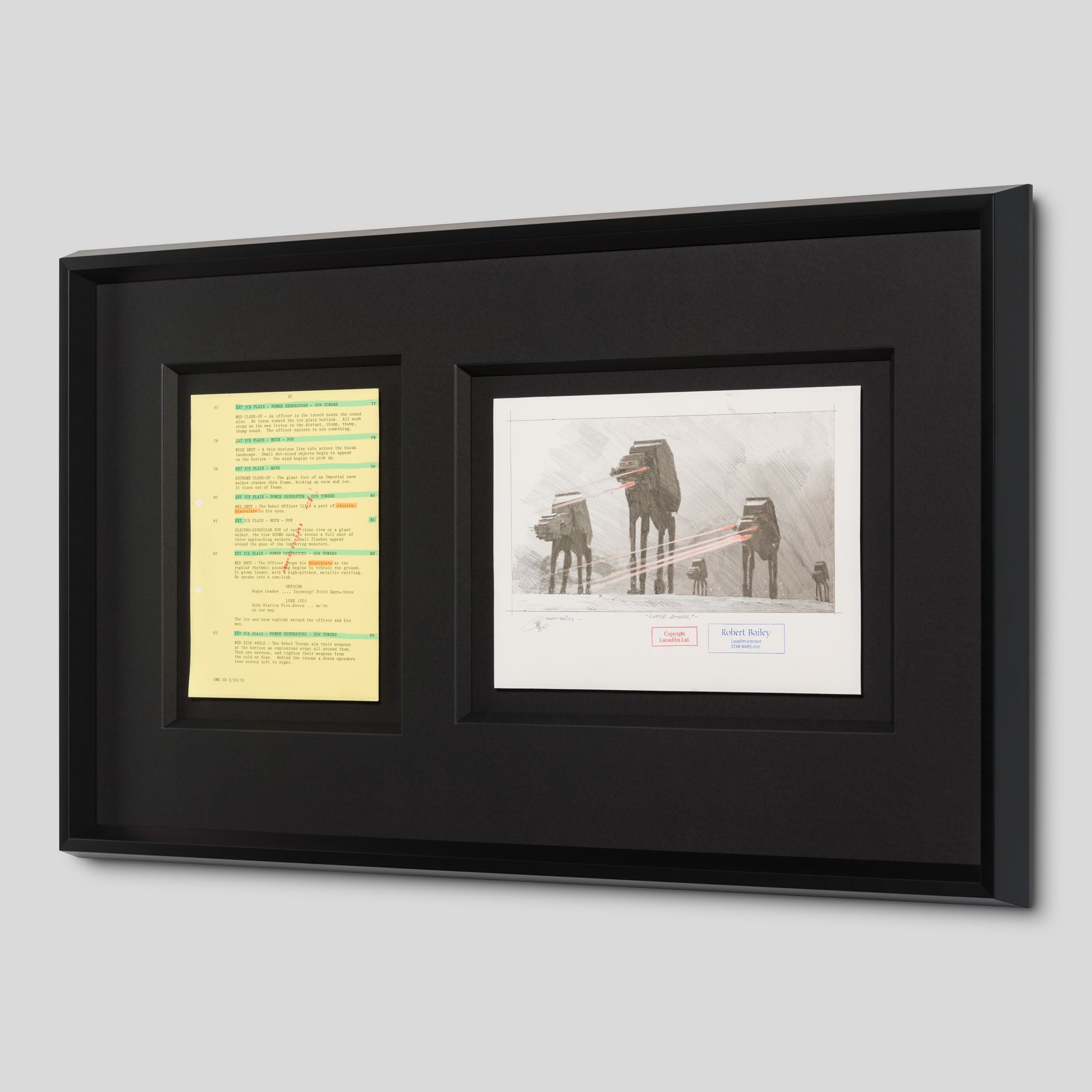The script has 5 different coloured pages throughout the pages, which shows the changes between each edit that would have happened through the process of creating the film – in this case the yellow pages are from 20th February 1979. This piece is in museum glass. Alongside Robert Bailey’s signature, every piece has two different coloured stamps: a red stamp for the copyrights of Lucasfilm and a blue stamp for mark Bailey as a Lucasfilm endorsed artist.