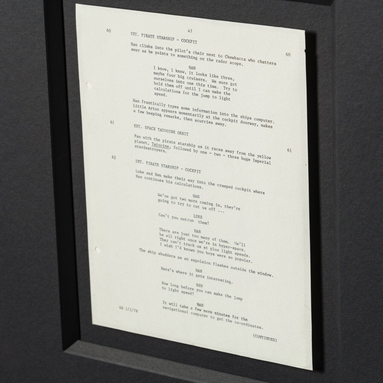 His 145-page draft script, credited to Lucas, is dated January 1, 1976. The visibly worn title page has Daniels' name stamped on it and features the title “Star Wars”.