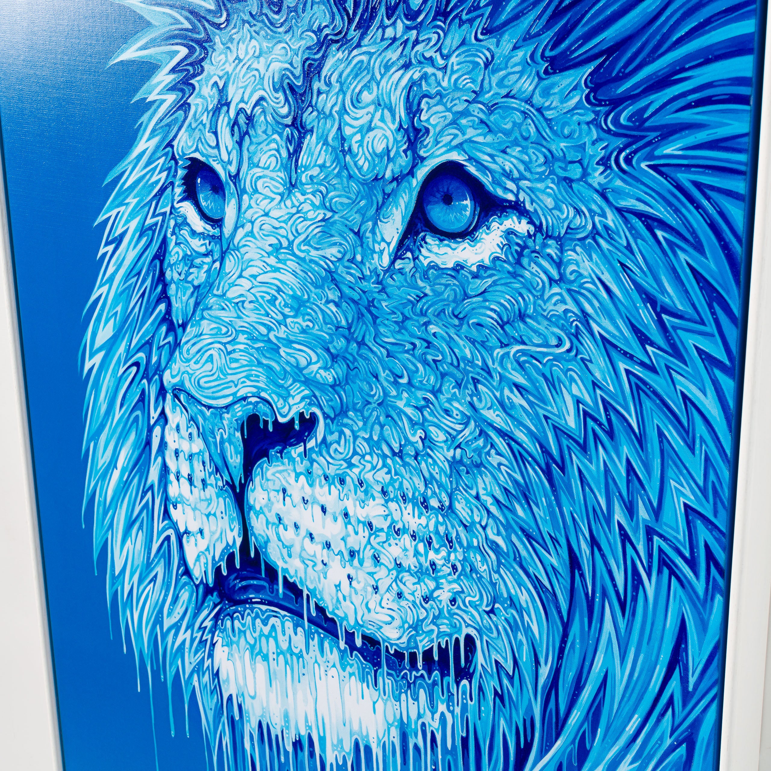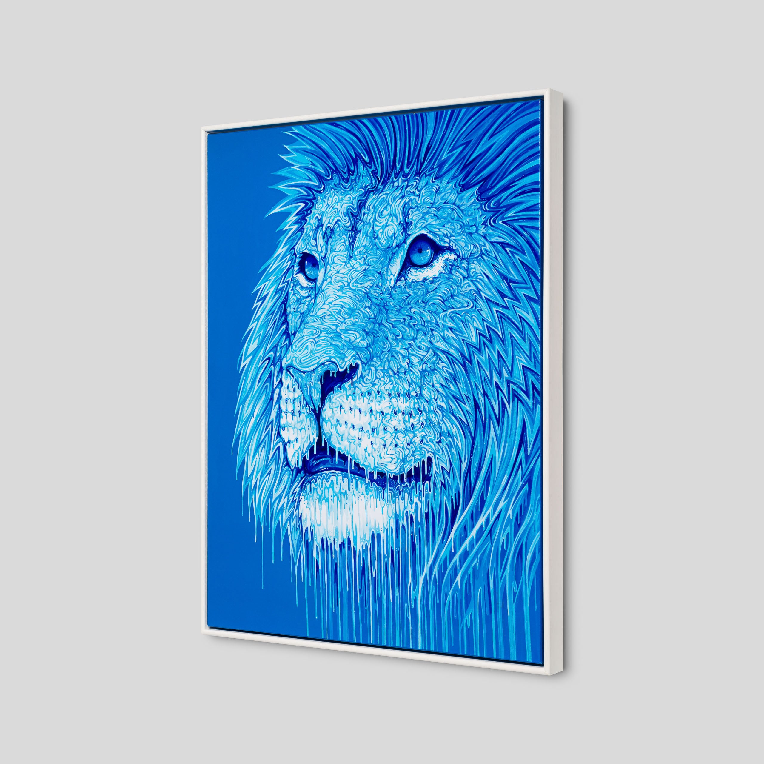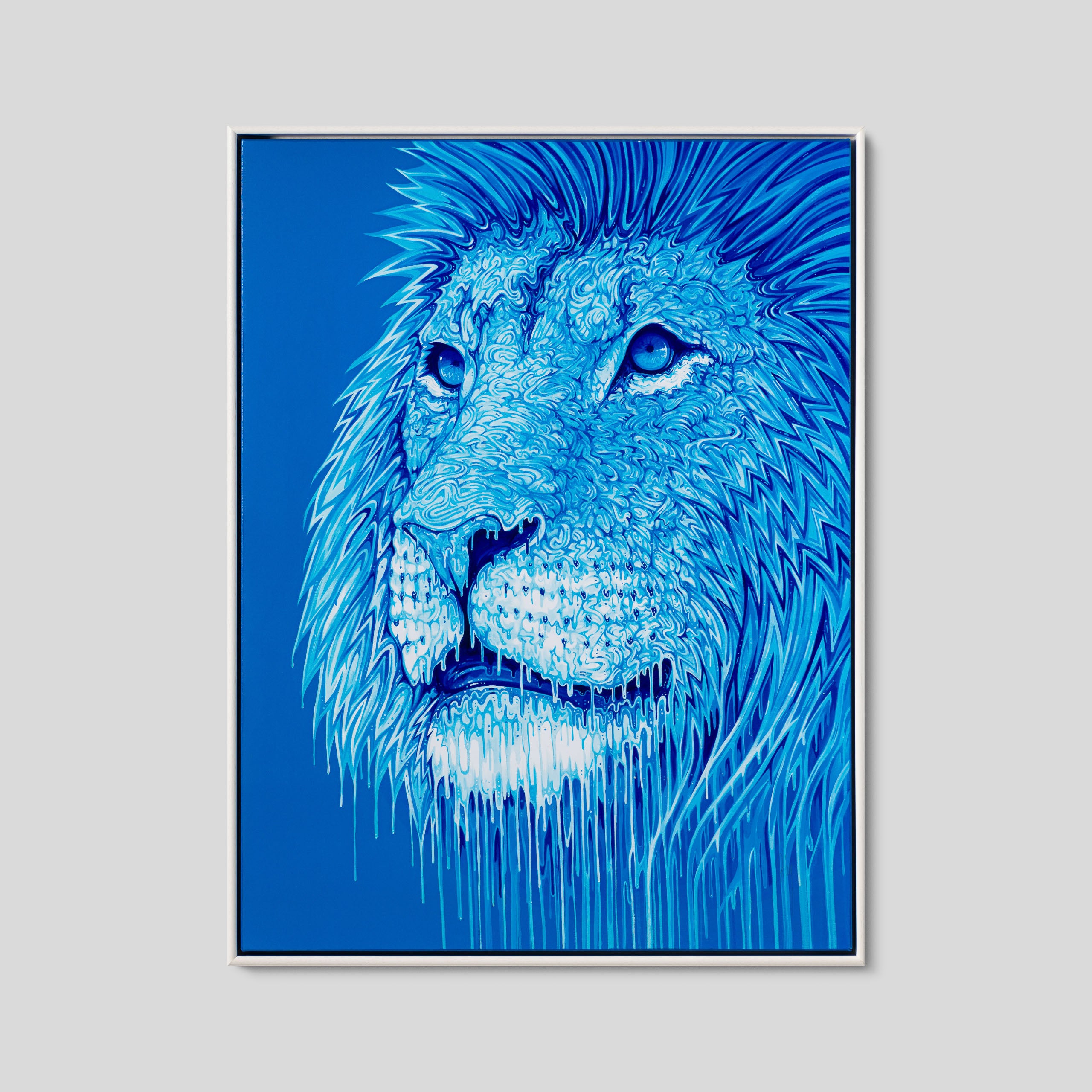 After experimenting with a range of colours, Oxley ultimately chose blue due to its calming nature. Discovering that using one colour streamlined his work, he modified his approach to painting, finding the form of the lion first before adding his signature drips. The eyes of the lion captivate the viewer as they are steady whilst the rest of the piece exhibits a dream-like effect.