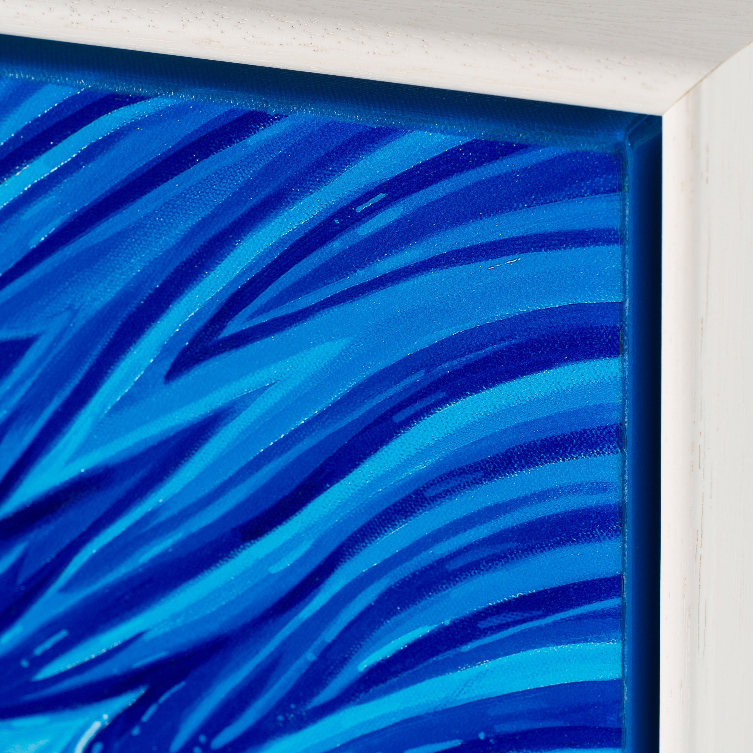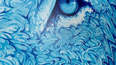 The continuous swirling lines Oxley uses in this painting capture the grace and motion of the lion in the wild. The artist creates this feeling of movement, almost like a breeze, in the bold zigzags of the lion’s mane. Using his palette of blue tones to enhance the detail of the painting, Oxley gives the piece a sense of life.