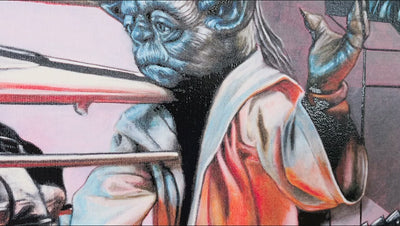 ‘Star Wars Guernica’ is the grand culmination of English’s playful ‘Popaganda’ style, in which he blends references to popular culture with famous characters and art historical imagery. Meanwhile, the characters stand on a red carpet of English’s imagining, adding a cinematic quality to the painting, as if in reverence to the source material on screen. It is the recognisable cast from George Lucas’ epic space story who appear in his frame: Darth Vader, R2-D2 and Yoda are caught in dramatic battle, echoing Picasso’s action-packed composition. Simultaneously evoking the sprawling special effects of the films, English has created a detailed tableau in which rebel forces between good and evil battle for domination. Having taken on one of the best-loved film franchises of all time, and merged it with Picasso’s great masterpiece, English has found the freedom to visualise “Something that is a cultural phenomenon” through his own highly imaginative lens, elevating it to icon status. In his absorbing Star Wars-themed artwork Ron English has captured “the whole film in one shot.”