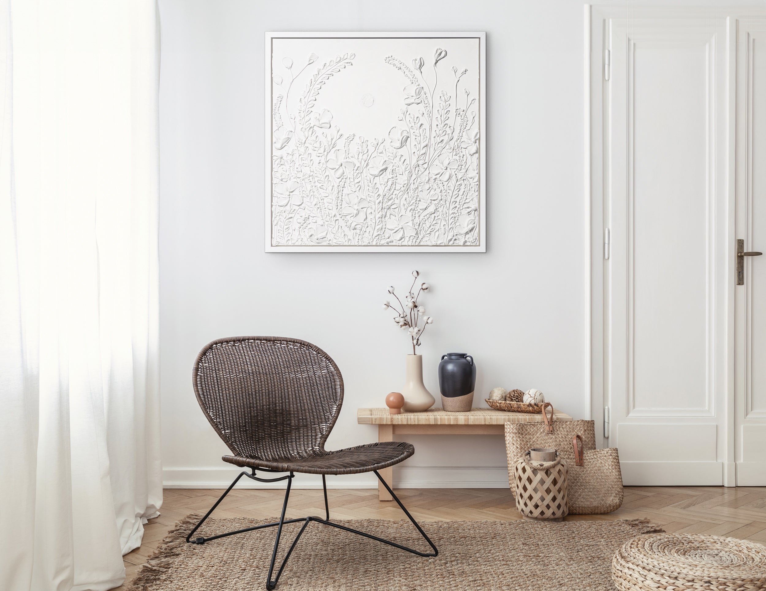 The flowers, symbols of beauty, growth, and renewal resonate deeply with her, serving as beacons of hope amidst the darkness, also express her connection to impressionists such as Vincent Van Gough. The beautiful serene and contemporary white compositions are still full of movement as the artist told us: “The flowers needed to feel free, you needed to feel the wind they are dancing in” inviting viewers to project themselves on the heavily textured paintings, creating a pure source of comfort and grounding, anchoring them to the present moment.