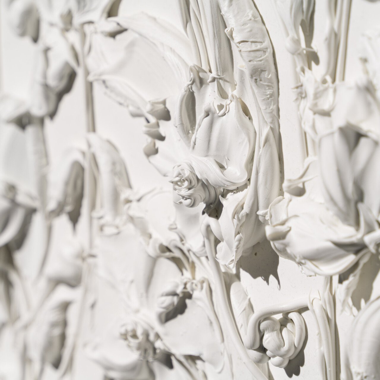 The flowers, symbols of beauty, growth, and renewal resonate deeply with her, serving as beacons of hope amidst the darkness, also express her connection to impressionists such as Vincent Van Gough. The beautiful serene and contemporary white compositions are still full of movement as the artist told us: “The flowers needed to feel free, you needed to feel the wind they are dancing in” inviting viewers to project themselves on the heavily textured paintings, creating a pure source of comfort and grounding, anchoring them to the present moment.