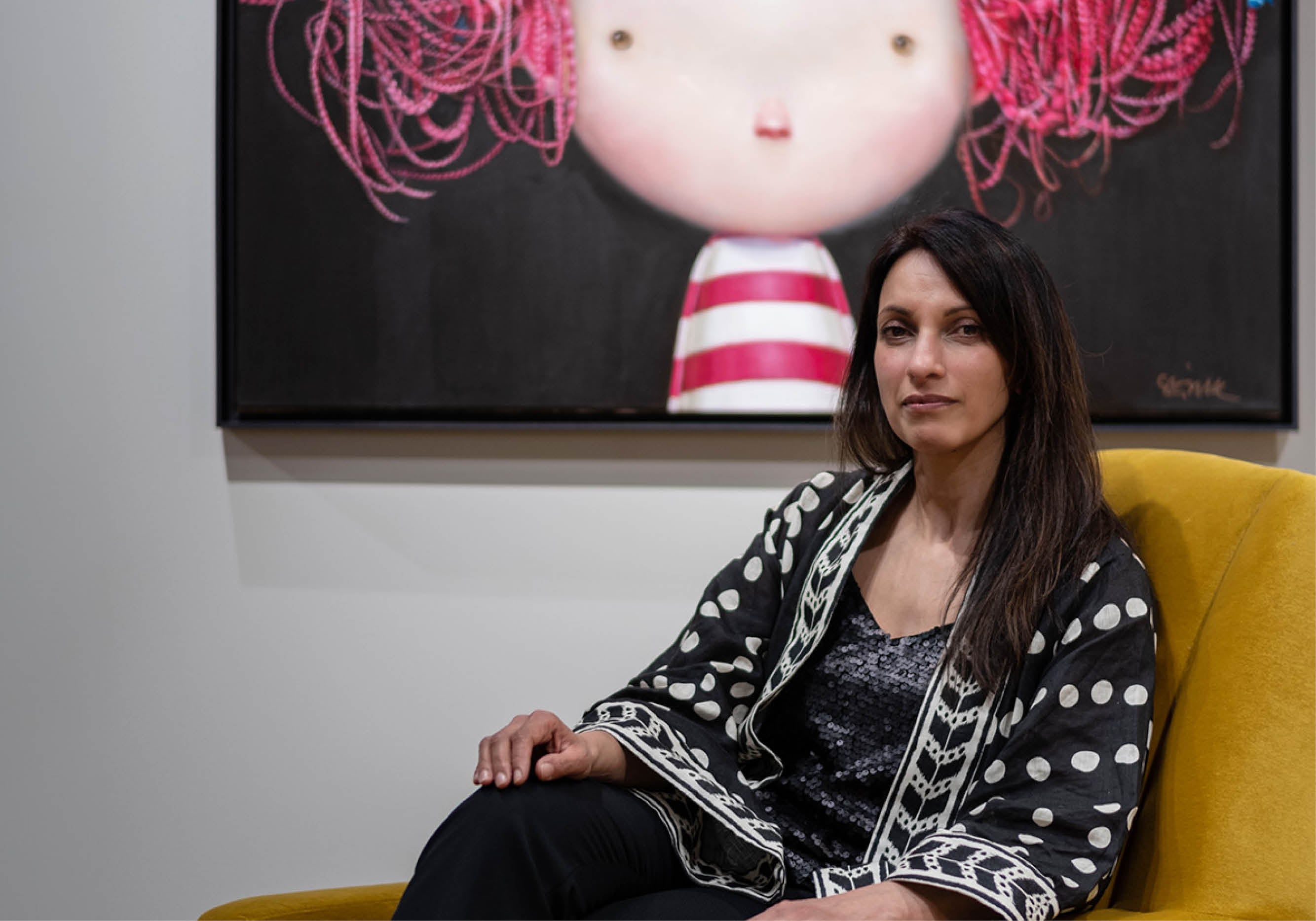 Shazia began her career in a greetings card company, then went freelance and started a family. She is now a full-time artist, famed for her perceptive paintings of children and young people. The bright and cheerful colours she uses in them are inspired by her travels in South America, where she took a trip after university with her now-husband Ian. 'We'd gone to Mexico and I was at Frida Kahlo's house where everything is really bright; there's nothing that's not colourful. I think I try to bring that into my work, with the children with red hair and bright, stripy t-shirts and things like that.'