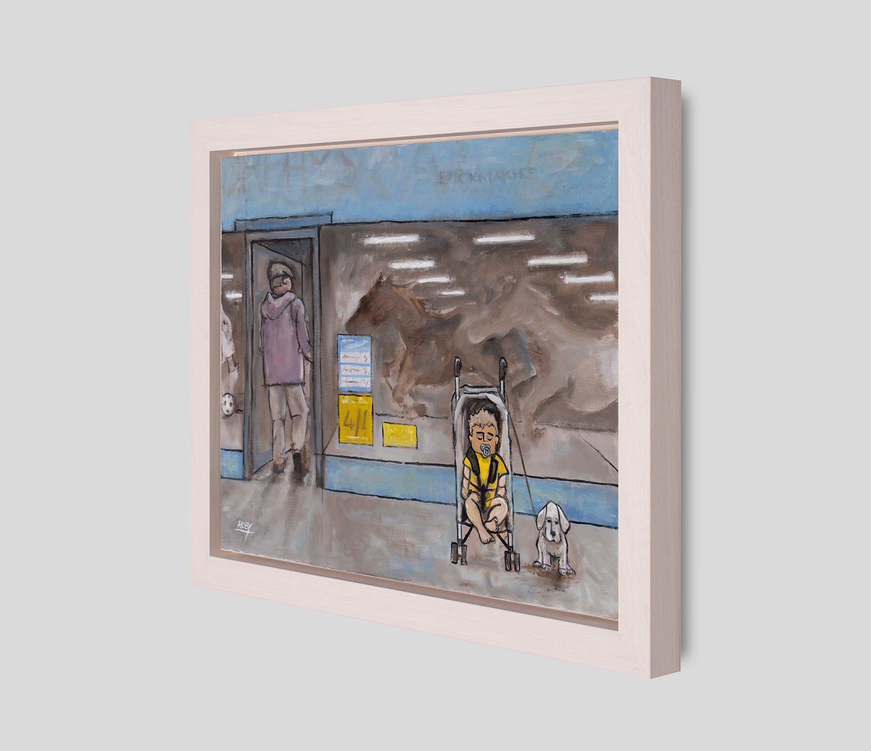 From the heart-warming to the hilarious, Stephen Roby uses his bright artistic style to interpret a range of scenes from his memory and imagination. This particular piece was " based on an event that happened during my childhood. My father was a gambler and spent most his earnings in betting shops. He took me for a walk to the local betting shop when I was about 10 months old. He had won a significant amount for a change and rushed back home to tell my mother. Unfortunately, he had left me in the pram outside the bookies."